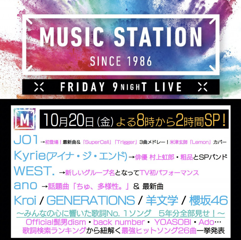 Grosse soirée en perspective dans un spécial de 2h de Music Sation avec Aina The End/Kyrie, ano, et Hitsujibungaku entre autres.