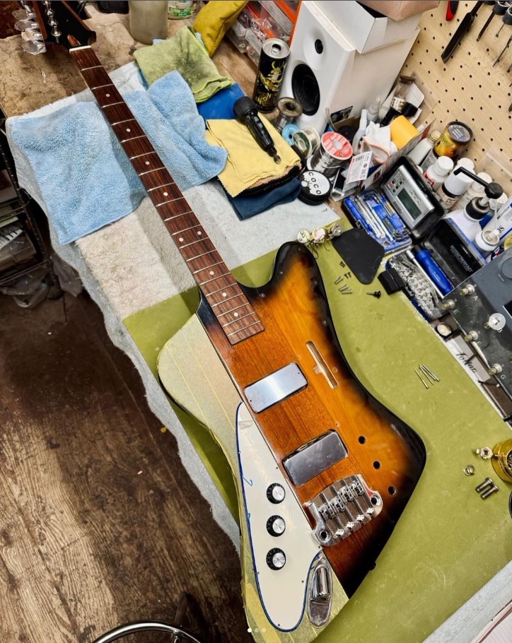 Waka est en train de faire transformer cette bonne vieille Thunderbird pour en faire un modèle adapté à une gauchère - et les choix sont particuliers! Notamment l'usage du pickguard comme supporte des contrôles, et l'installation d'une sortie jack stratocaster ... inversée. On s'y perd dans tout ce qui est "reverse" dans ce modèle