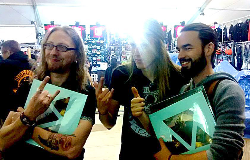 Photo que j'aime bien... Nick DiSalvo, le guitariste de Elder, savait pas comment nous remercier de lui avoir sauvé sa SG..... Il nous a ramené une tonne de mersh (tshirt, disque collector, ...) l'album est excellent dans le genre gros Stoner avec des plages de 12, 15mn bien tripantes !