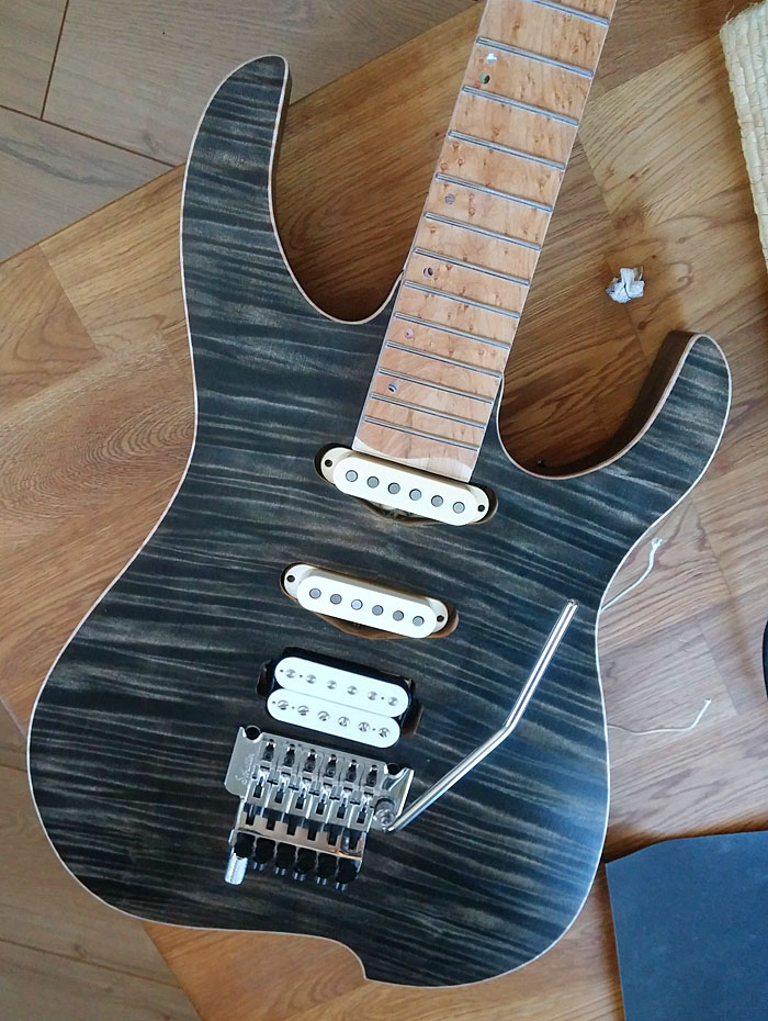 Comme je voulais un Floyd posé sur la table, il fallait incliner le manche pour garder une hauteur de cordes correcte par rapport aux micros.