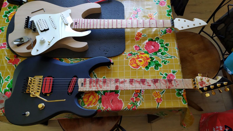 Mais ce n'est pas du tout la même approche, celle que Nono a demandé à Remige c'est sa vision de la Superstrat ultime, polyvalente, hypra bien finie, Remige à soigné chaque détail et a mis le temps... c'est pas une guitare à fracasser sur scène...