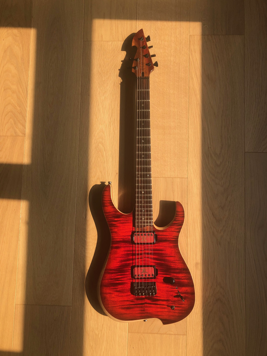 Une guitare bien rouge, avec une tête hameçon et une virgule familière. Et dans le département d'à coté en plus.