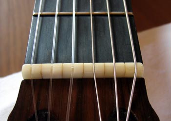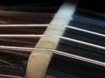On voit que mon sillet est composé de 6 morceaux séparés les uns des autres afin de limiter au maximum les phénomènes de transmission de la vibration d’une corde à l’autre.
