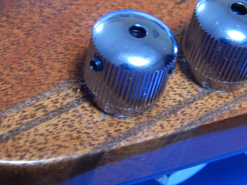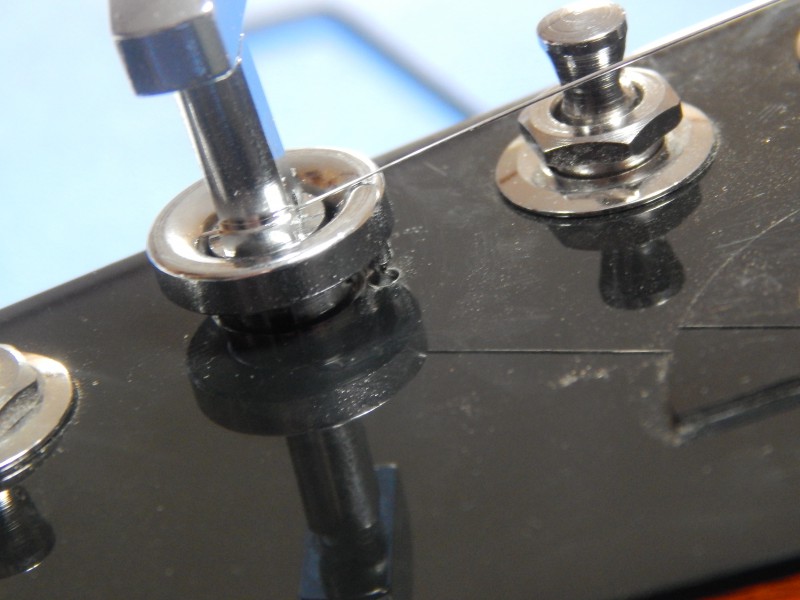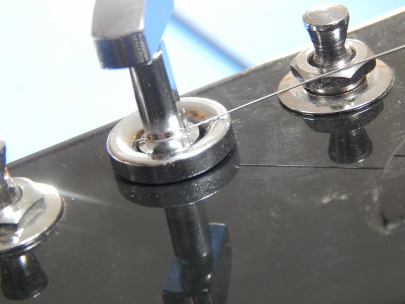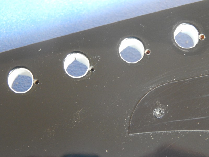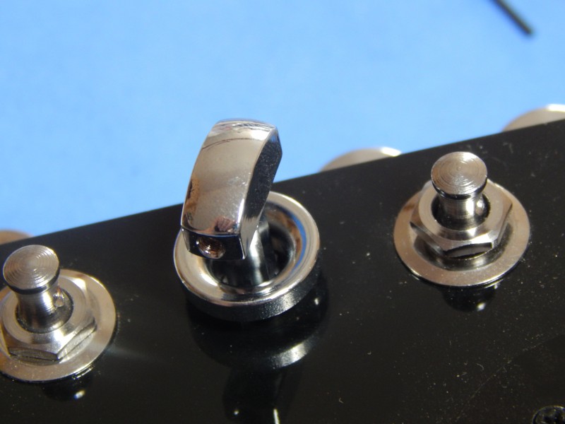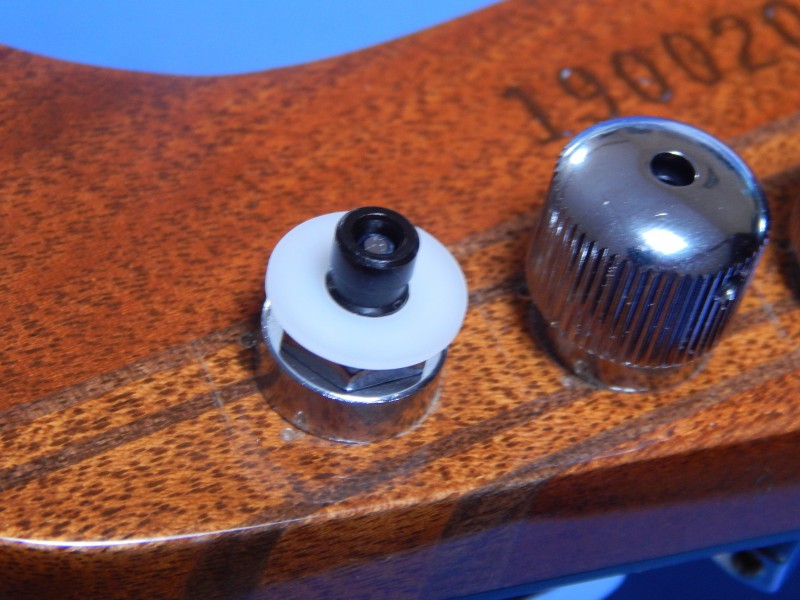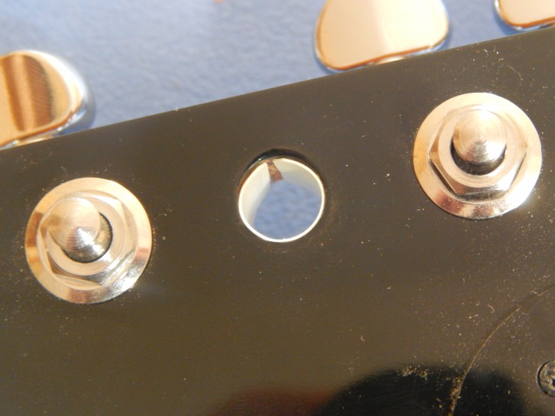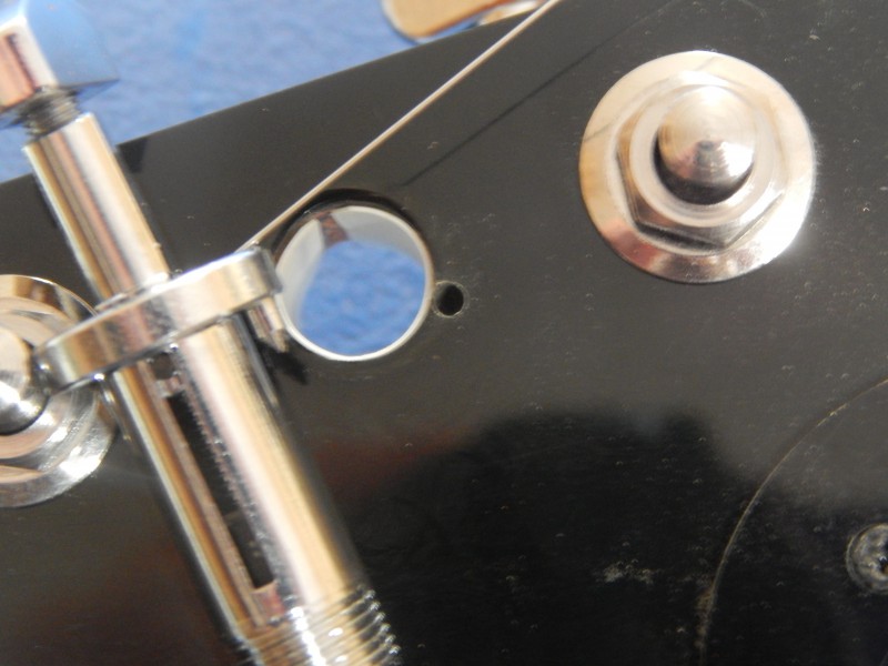 Il ne reste plus qu'à percer le trou d'indexage de chaque mécanique (pour que le trou de passage de la corde soit parfaitement face au sillet). Ce trou est suffisamment proche de la de l'alésage de la mécanique pour que la rondelle de chaque mécanique Grover le masque si on remet la guitare dans son état d'origine :