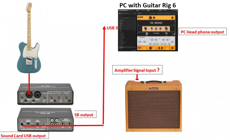J'ai une carte son externe sur laquelle est connectée la guitare; cette carte est naturellement connectée à mon PC par un câble USB. Sur mon ordi, j'ai le logiciel Guitar Rig 6. Je voudrais envoyer mon signal depuis Guitar Rig vers mon amplificateur; et là je suis coincé.