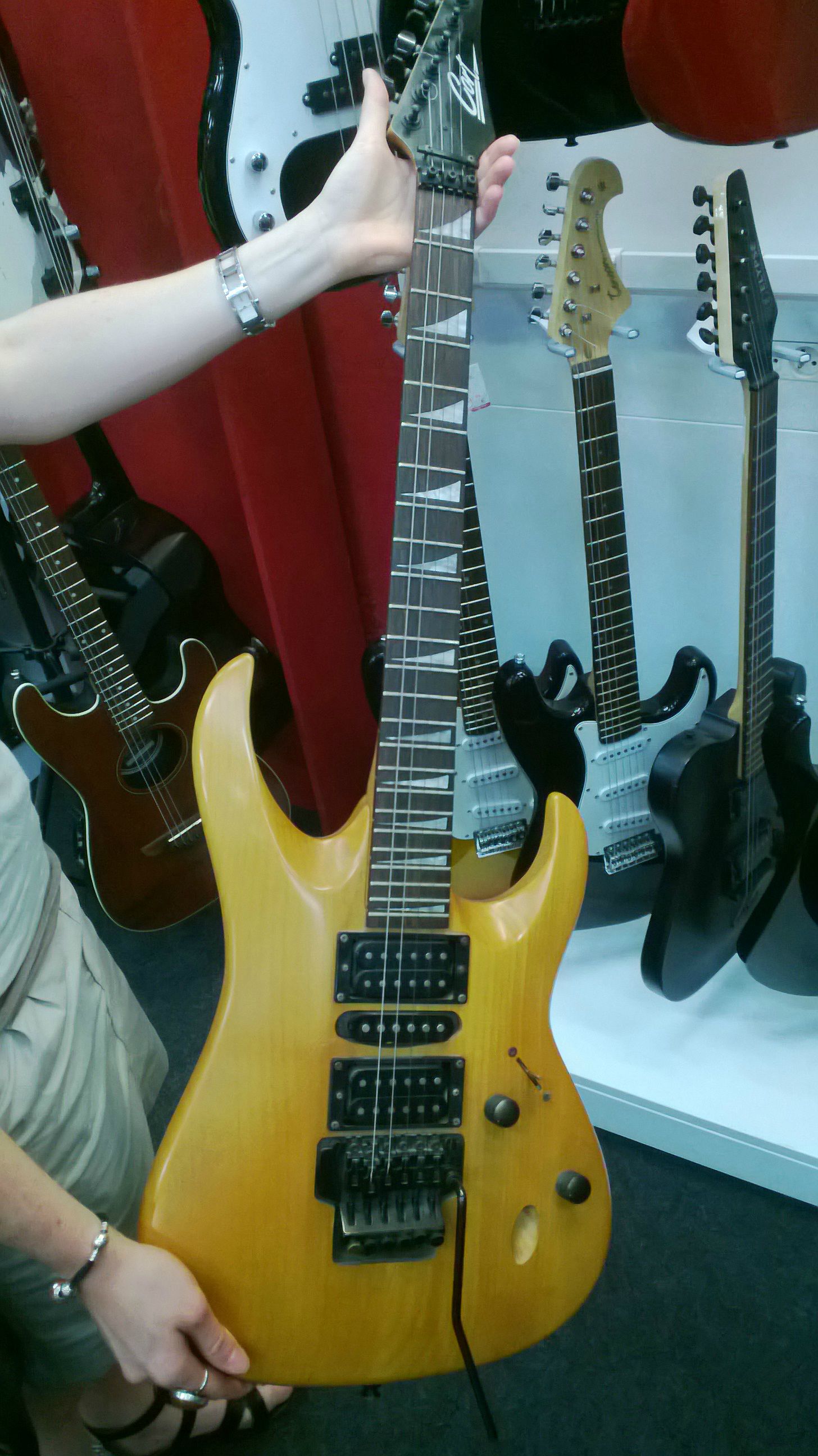 sur la tête, qui est noire, il y a juste écrit "cort". La guitare est de couleur naturelle/marron. Elle ressemble beaucoup à la viva d'après mes recherches, sauf que les inlays sont des dents de requin et non des points !