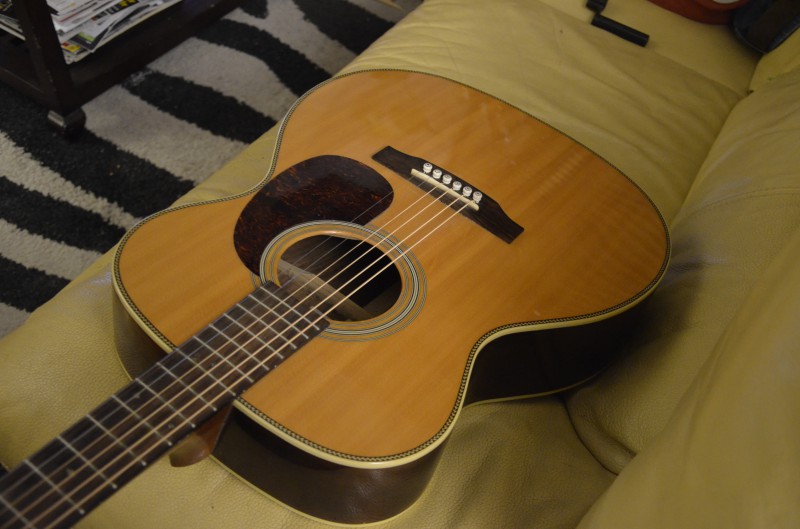 1. le chevalet est dans le bon sens : la compensation de la 2e corde est à sa place et j'ai vu des chevalets usinés de la sorte sur des Martin 000 dont cette guitare semble être une copie : j'ai moi-même possédé une 00028-EC dont le chevalet était identique, mais quand j'ai fait régler la guitare par Alain Queguiner, il l'a remplacé par un chevalet en os bien plus standard, et c'était mieux pour tout dire    ...