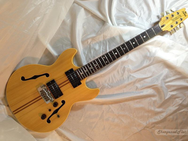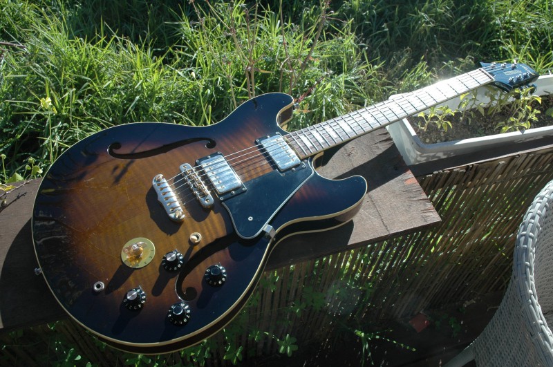 Cette guitare a été produite de 1981 à 1983. C'était ma première guitare électrique d'un niveau de qualité acceptable et mon point d'entrée dans le monde des 335 et c'est uniquement par une sorte de nostalgie que j'ai voulu en retrouver une, parce que, c'est pas pour dire, mais une 335 est quand même à des années-lumière de cette modeste Aria (c'est facile de comparer, j'en ai une). Mais ça reste une belle guitare de construction sérieuse, une bonne japonaise vintage milieu de gamme en quelque sorte. Après tant d'années elle reste parfaitement fonctionnelle, le manche est bien droit, elle est parfaitement jouable, l'électronique crachouillait à peine (un coup de bombe contact et hop, terminé) et je pense que son point faible est surtout ses micros, qui avouent vite leurs limites.