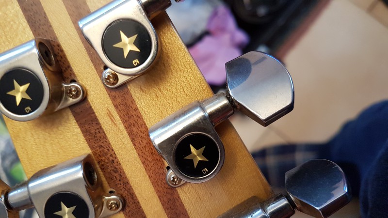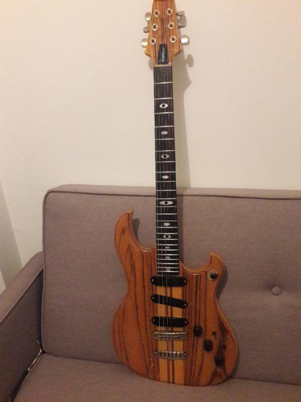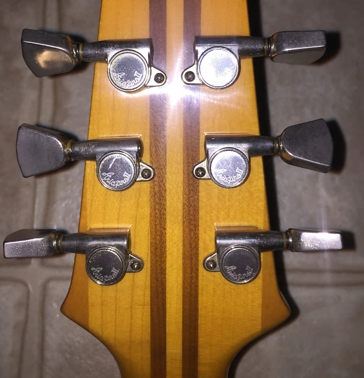 Après des mois et des années restés à l'affut, j'ai fini par trouver la guitare de mes 20 ans, une Aria Pro II TA50 en finition "japan brown", à un prix raisonnable et en parfait état, entièrement d'origine à l'exception des mécaniques qui ont été changées.