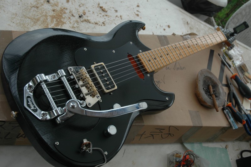 J'ai juste soudé le fil du micro sur un jack pour la faire causer. C'est bien, très bien même ! On a toutes les vertus d'un gros simple : de l'attaque, de la dynamique, du tranchant et du gras bien rocailleux quand on fait chauffer les lampes. Je craignais d'avoir trop d'aigus mais ce n'est pas le cas. La guitare me semble avoir pas mal de sustain. Pour l'instant, c'est assez prometteur.