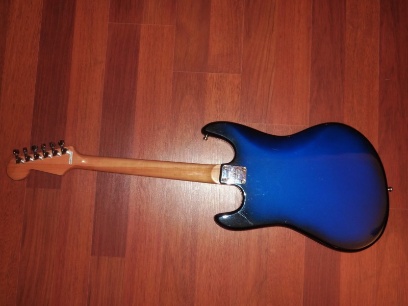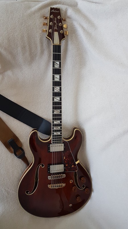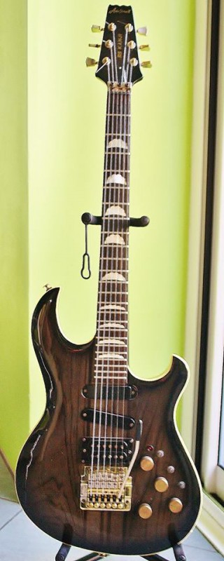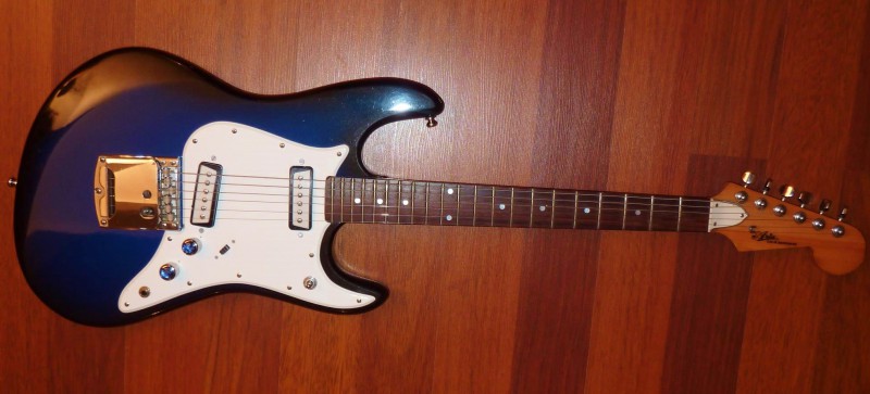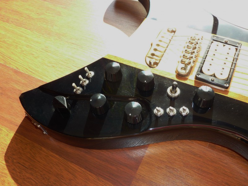 Le pickguard a été remplacé provisoirement par un modèle tortoise 4 plis pour Les Paul que j'ai retouché, j'ai aussi changé pas mal de visserie et de l'accastillage doré.