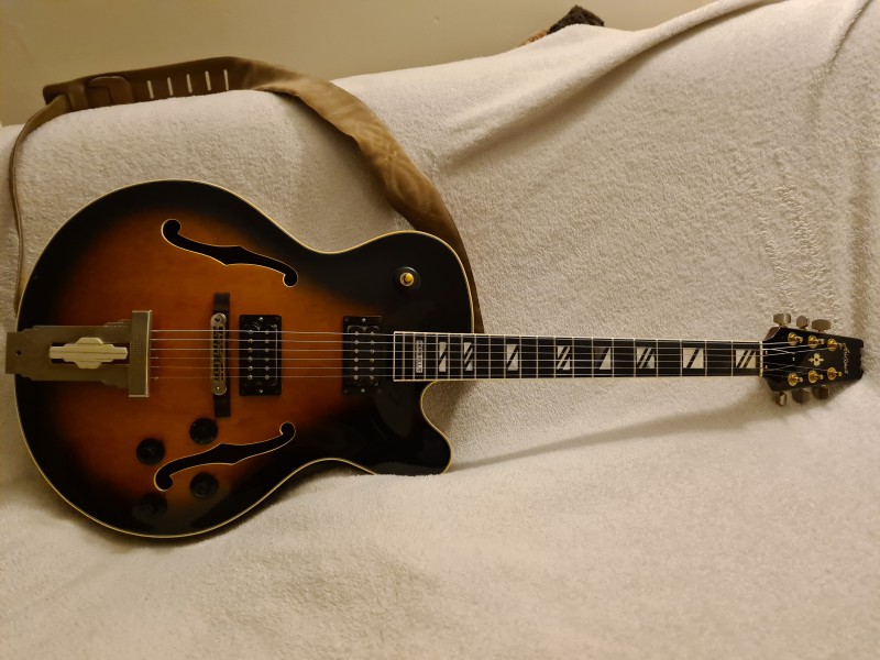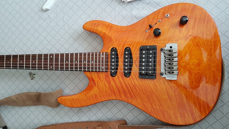 Ce n'est pas une Matsumoku mais une première main de 1996. C'est une Magna Series, probablement une MAC 60 mais je n'en suis pas certain. Elle est pas trop mal équipée : mécaniques Gotoh, vibrato Wilkinson, micros Duncan Design, condensateur Orange Drop (pas d'origine je pense).
