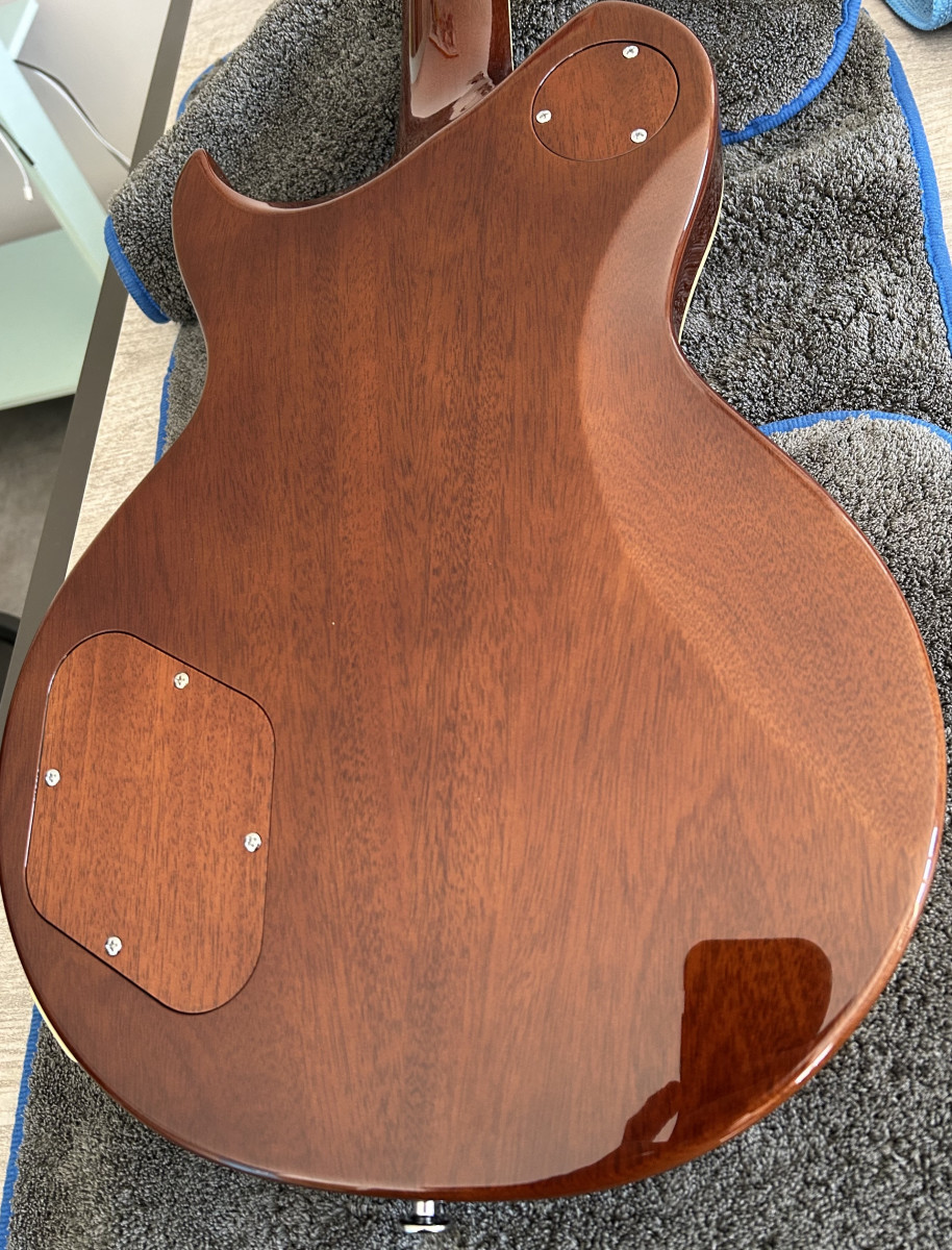On reste sur une ergonomie plus moderne type les Paul, avec une jonction manche-corps ergonomique, une découpe ventral et un corps un peu plus fin qu'une les Paul classique qui le fait penser à une série que Gibson avait fait (la Custom Lite).