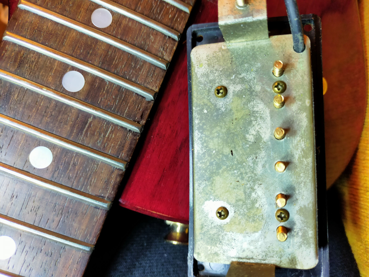 Micro pas encore identifié avec en sortie 7,9 kOhms mais à priori pas des Maxon car il ont 3 vis de fixation. Les miens en ont 2. Aucune indication au dos des micros.