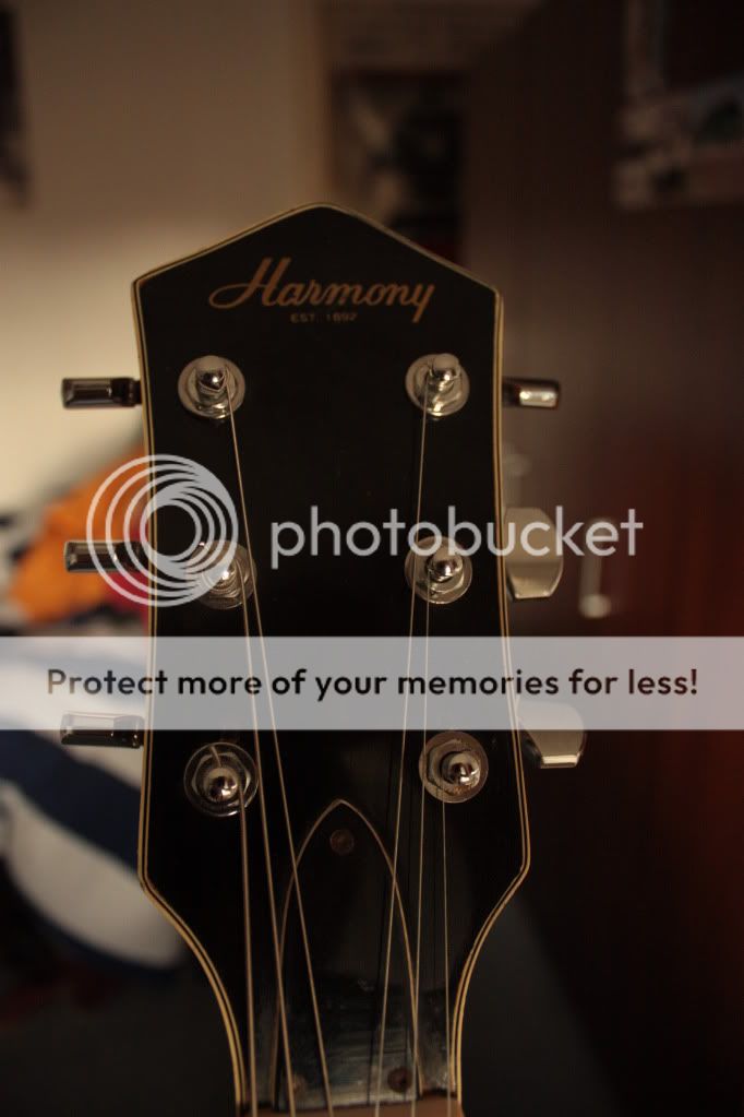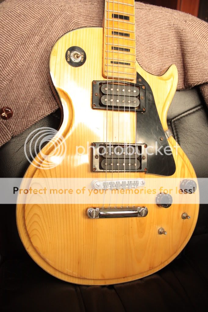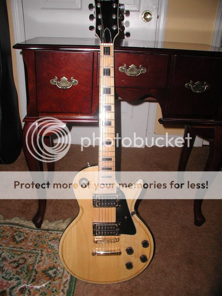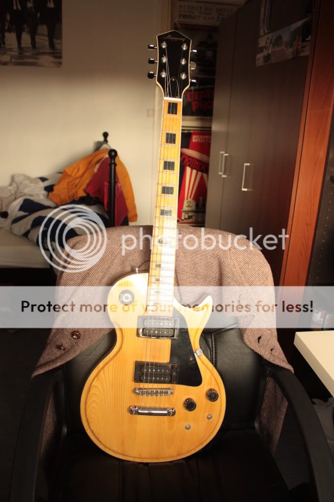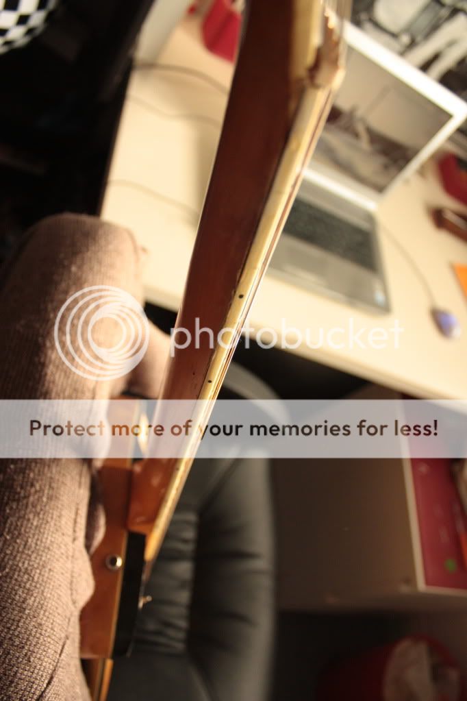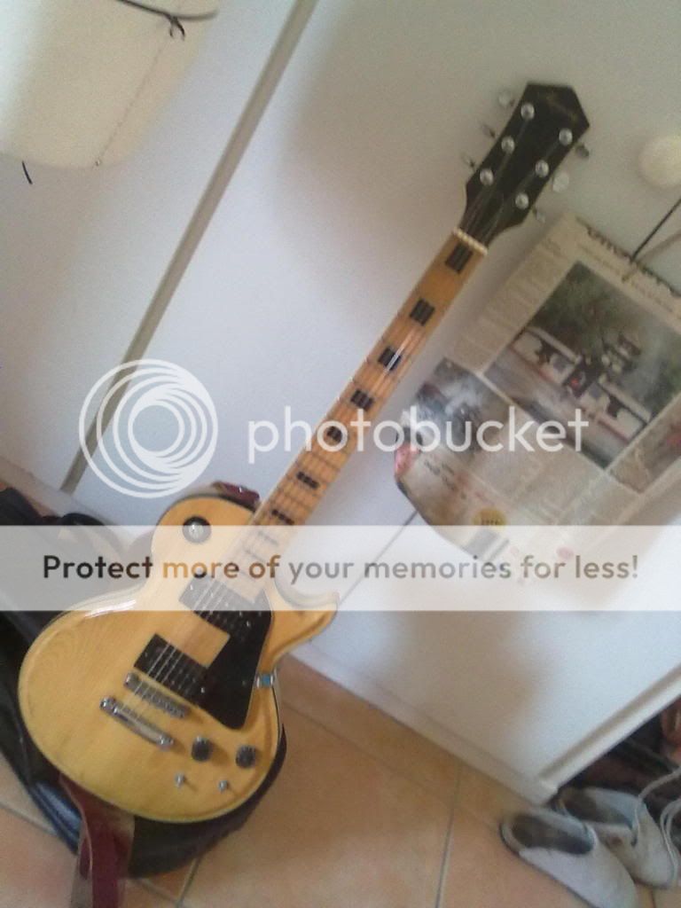 Donc voilà en attendant plus de photos, je peux dire qu'elle a quand même pris pas de coups durant son existance. Le manche a l'air en érable avec une touche en érable également, triple binding sur corps, manche et tête. Le manche est vissé. Les mécaniques sont des bains d'huile lambda pas d'origine. Il y a un chanfrein autour du corps arrondi