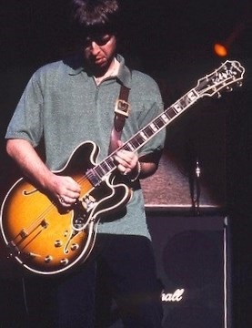 A partir de 98, il est définitivement passé chez Gibson, mais sur les concerts de 98, il commençait déjà à panacher entre son Epiphone Sheraton Sunburst et sa Gibson ES-355. Donc là, une Sheraton ll peut re-convenir puisqu'on revient sur du format grand humbucker.