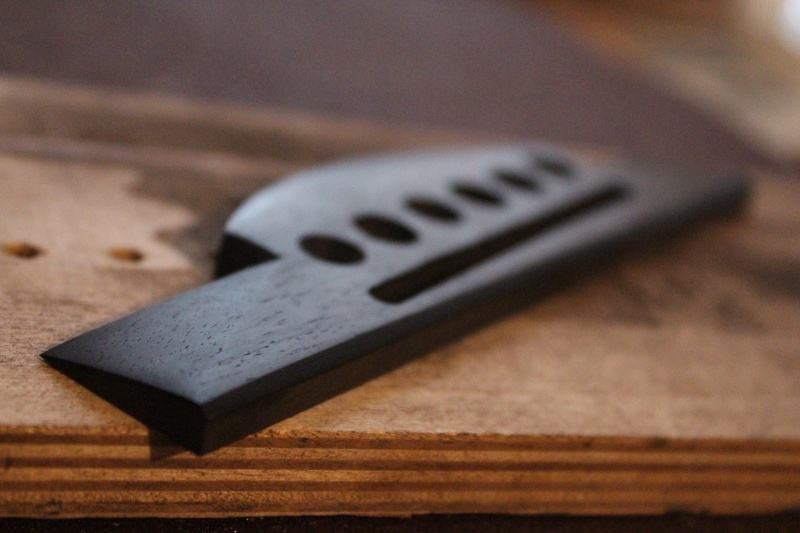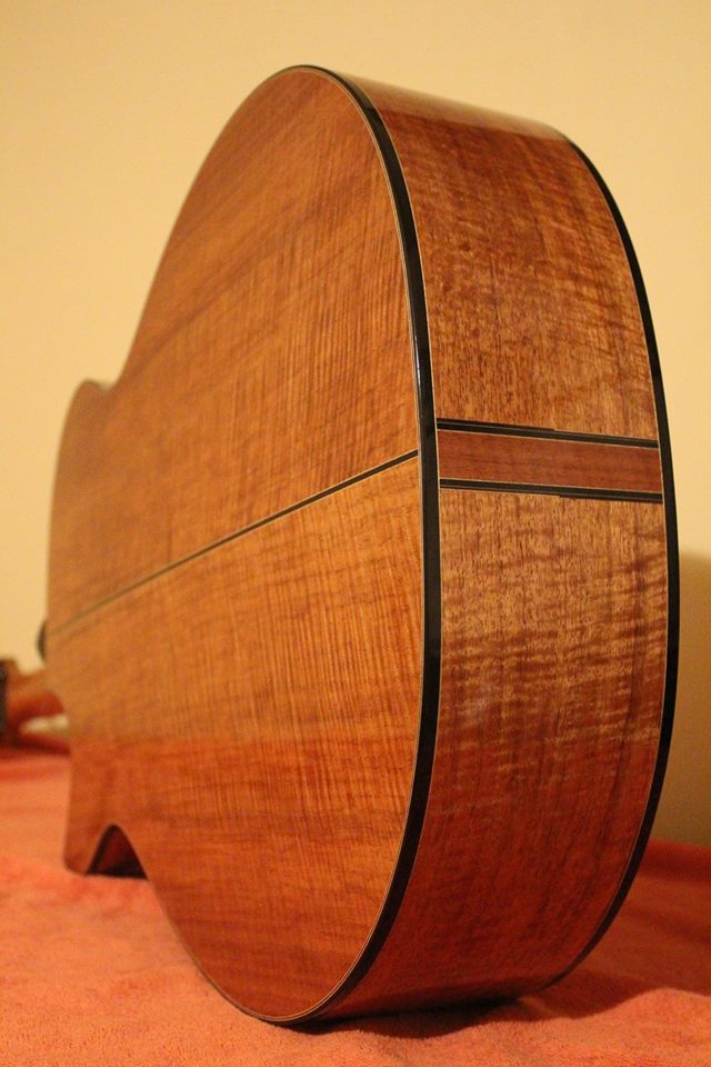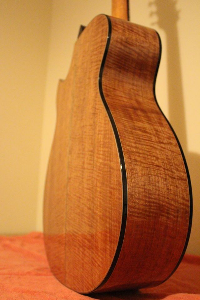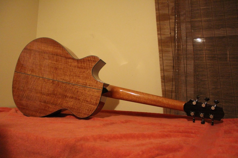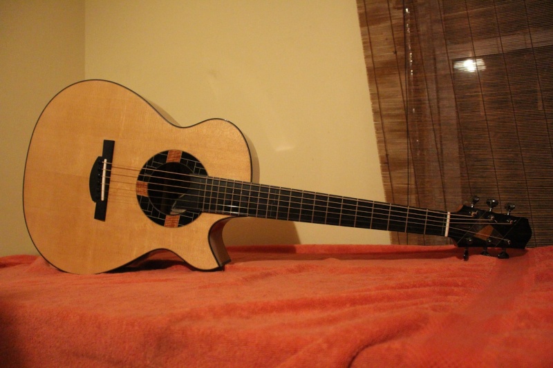 Voilà la petite dernière, une OM Cutaway avec un bois que l'on ne rencontre pas souvent: Du T'zalam (et ça déboite, oui oui). La table est en Sitka centenaire Salvaged, Bearclaw