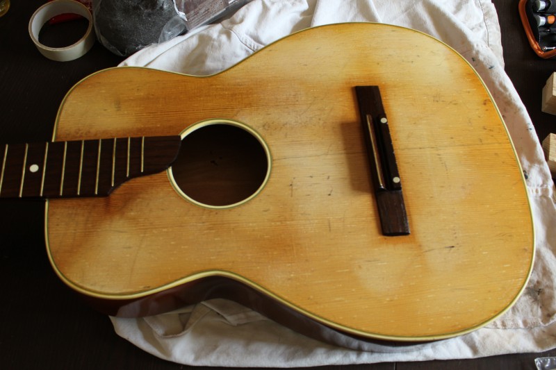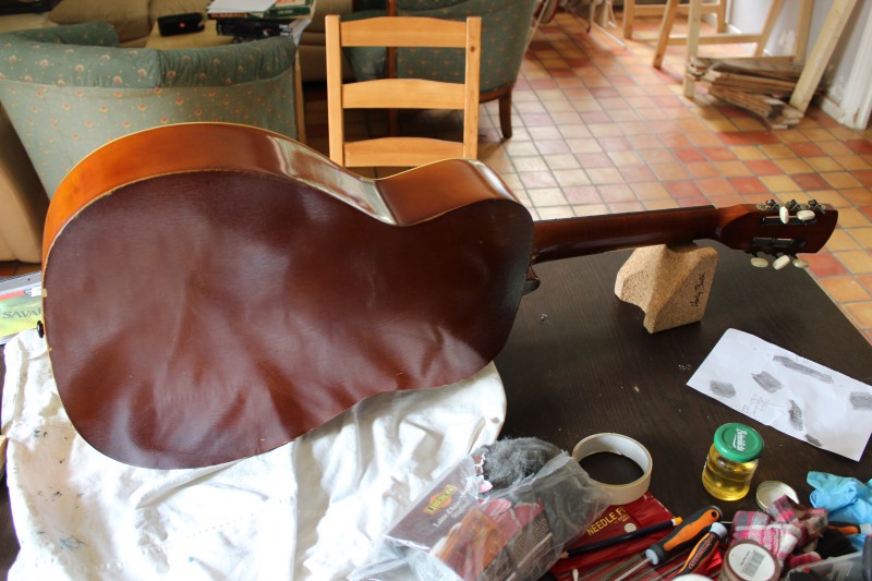 Difficile, d'après photos, de dire si le corps et la table sont en bois massifs mais ce que je vois du dos et à travers la rosace m'inciteraient à pencher pour un corps en plaqué. Il faudrait la voir en vrai !