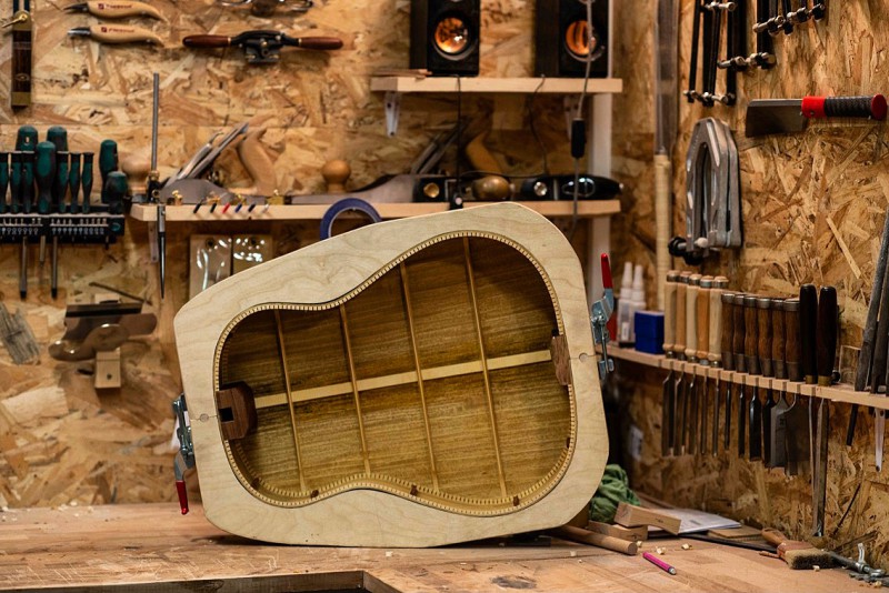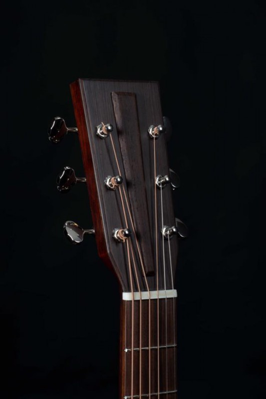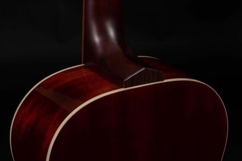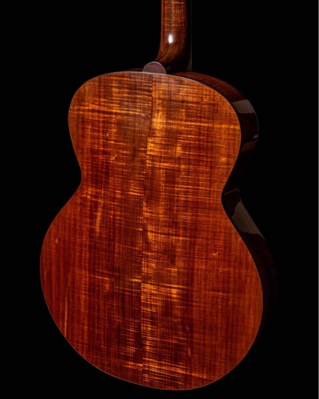 lower bout ?) et au moins un superbe bois visible, sinon reconnaissable (du koa, ou alors une grosse ressemblance avec ce dernier ; en plus du dos et des éclisses, on dirait que le manche hérite de la même essence, ce qui serait assez inhabituel, si tant est que ce soit bien du koa).