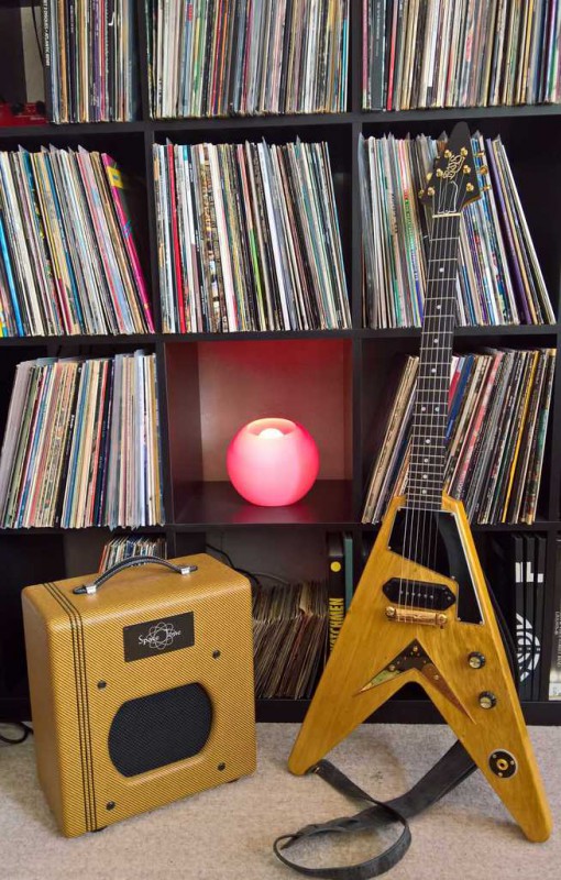 Ces derniers mois, j'ai enfin pu concrétiser un vieux fantasme: conjuguer mon amour de la Flying V (en particulier les modèles '58 en korina) et de la SG junior. L'idée n'est pas forcément originale, Chris Spedding l'avait déjà plus ou moins eue dans les seventies (mais avec une Flying V sixties).