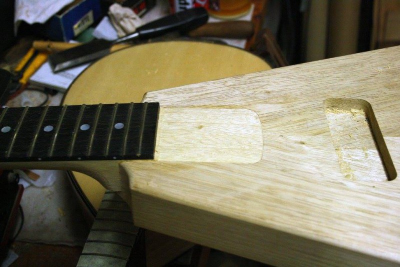 - corps et manche en korina, touche en ébène (oui, je sais: pas très junior ça - mais je voulais un contraste esthétique frappant)