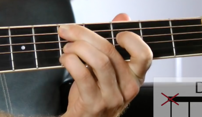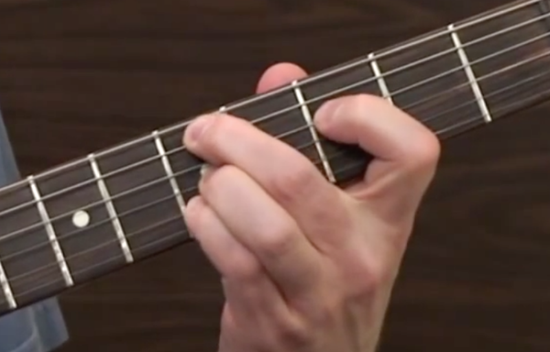 L'accord qui m'embête est pourtant indispensable dans mon jeu de bossa nova, il s'agit d'un min9 sur la corde de La, X5355X par exemple. Si mon majeur n'est pas exactement sur la frette, comme ci-dessous :
