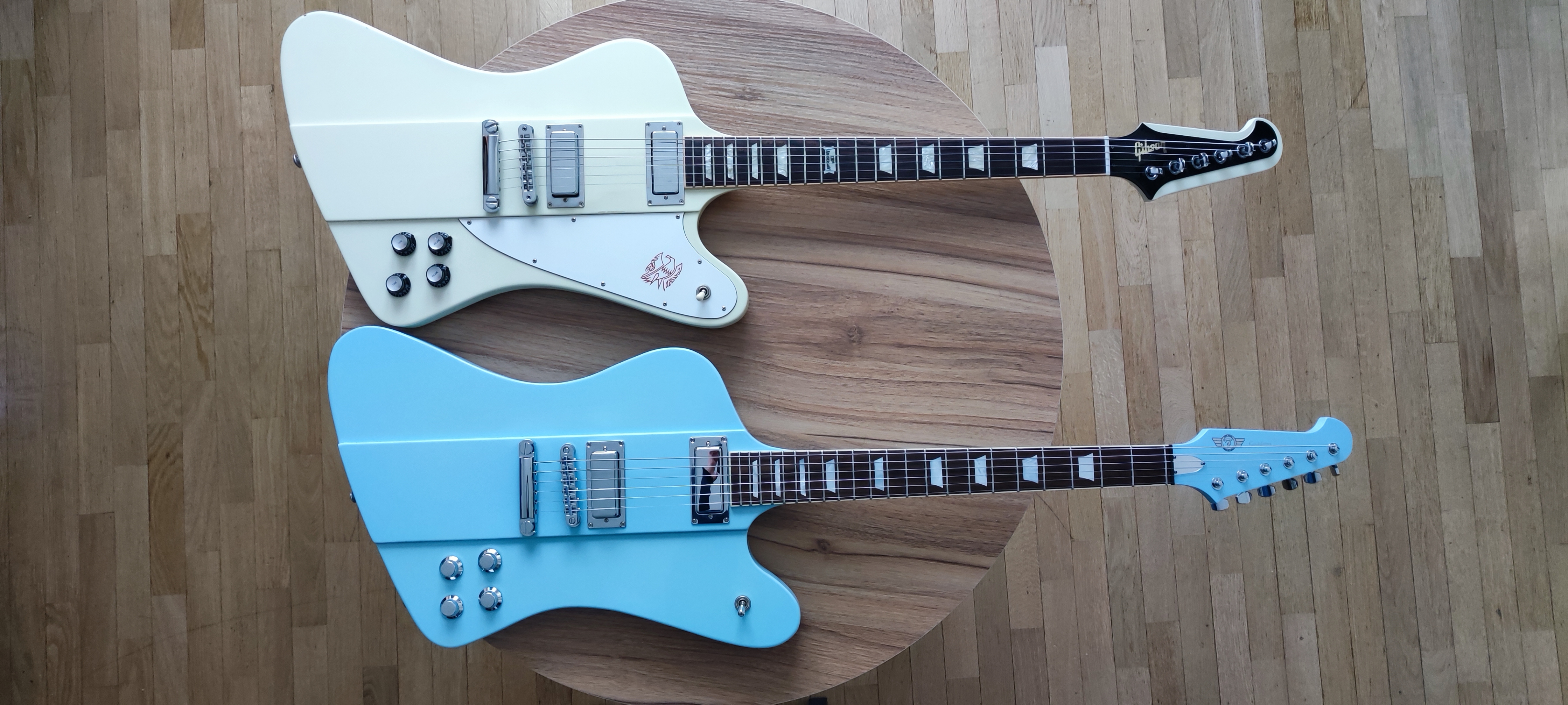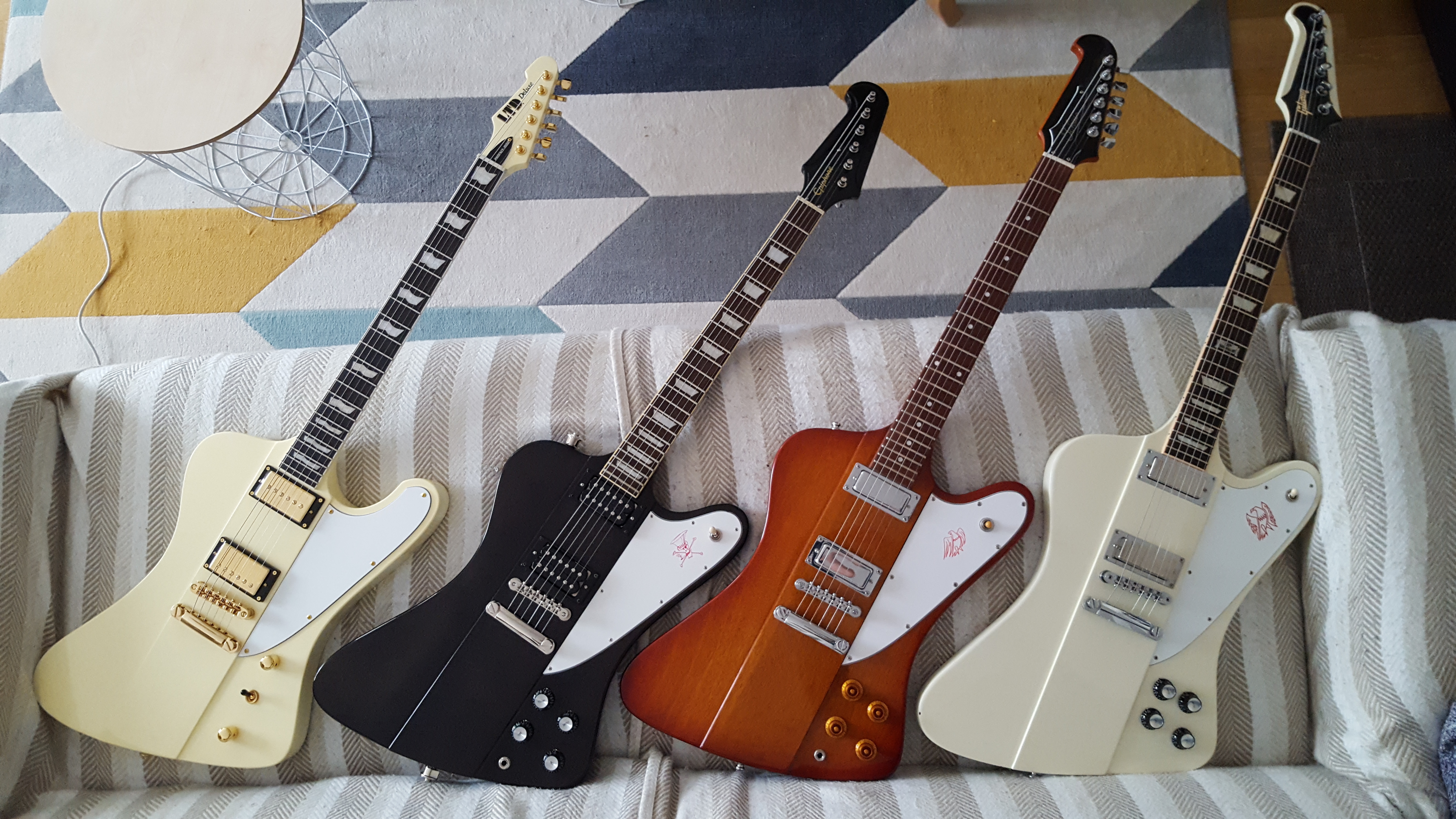 La Firebird est ma solid body préférée, le manche est vraiment confortable, l'accès aux aigus aisé et des micros qui sonnent vraiment (entre autres) en crunch, mais ce n'est que mon avis. Une photo de mes 4 firebird (j'ai gardé la Gibson mais je regrette d'avoir vendu ma Tokai).