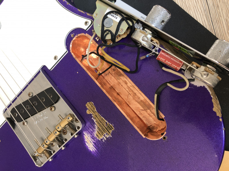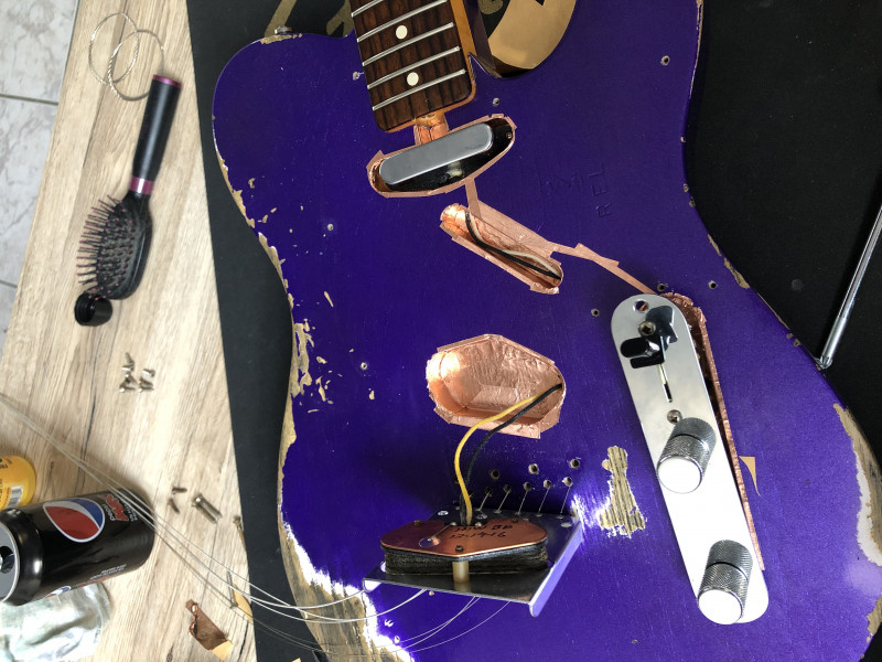 Par exemple, sur la Tele que je me suis faite, j'ai fait un blindage au cuivre, la connexion à la masse du circuit se fait par contact : avec la plaque de contrôle pour la cavité électronique, avec le chevalet pour la cavité chevalet, et avec un chemin de cuivre sous le pickguard jusqu'à la plaque de contrôle pour celle du micro manche.