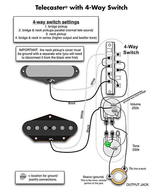 Je reviens vers vous parce que j'ai un soucis sur ma telecaster montée avec un sélecteur 4 positions. Le but est de faire une telecaster copie de celle de prince donc elle a 2 micros noiseless que j'ai chopé sur eBay. Le cablage fonctionne, j'ai scrupuleusement suivi ce shéma :