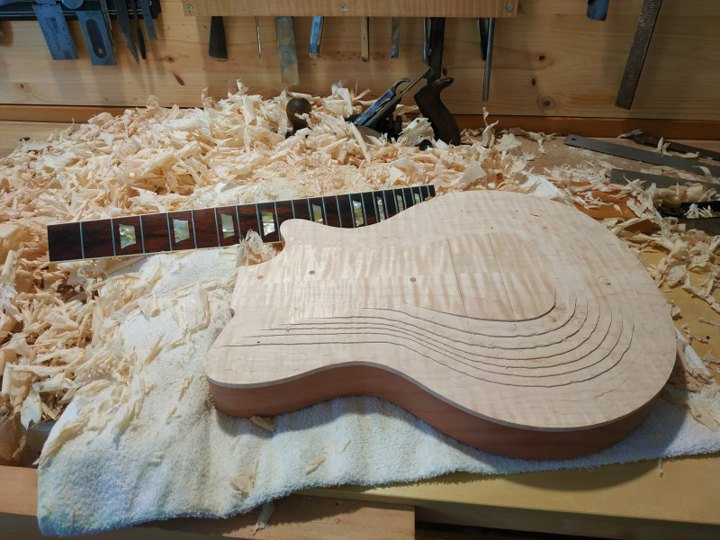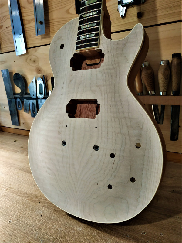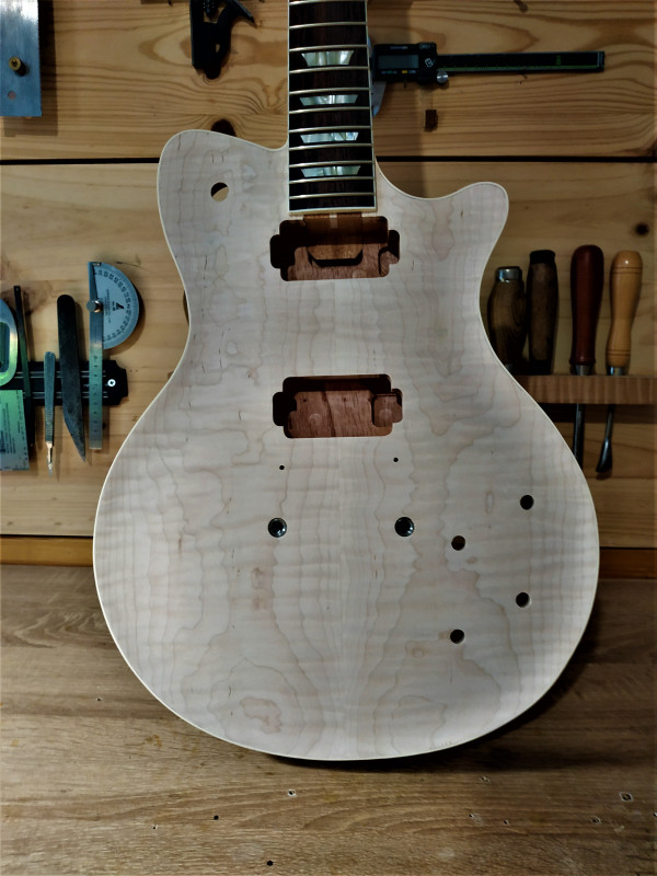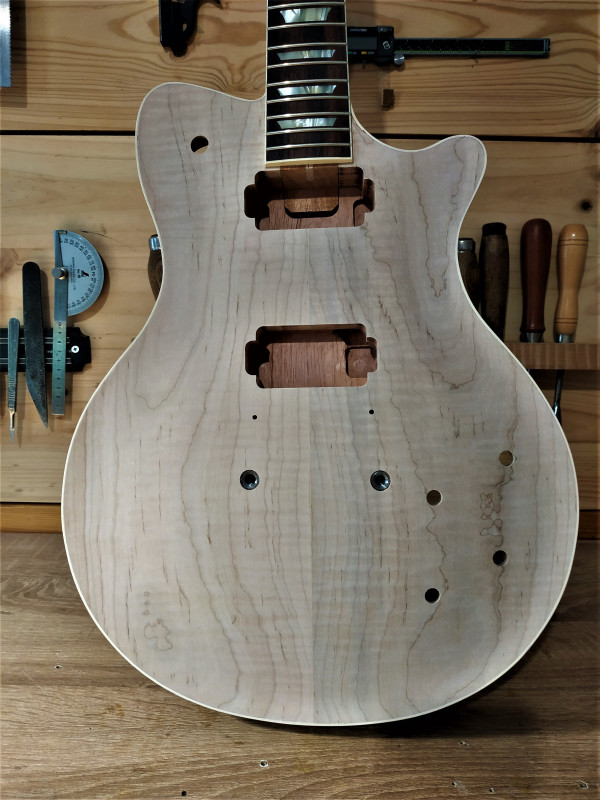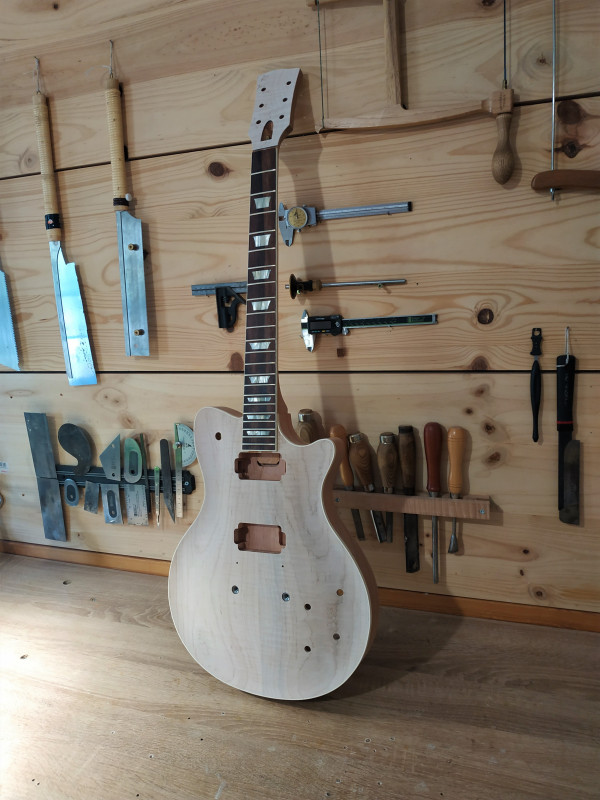la guitare est super équilibré quand on est assis, le manche et super confort avec juste l'acces en bas qui va bien!! ni trop ni pas assez!!
