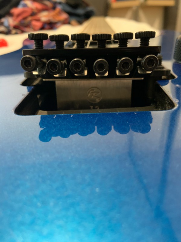 L'idéal c'est de caler le Floyd dans sa position zéro, changer les cordes, et ensuite réaccorder dans cet ordre : E-e-A-B-D-G , plusieurs fois jusqu'à ce que ce soit juste.