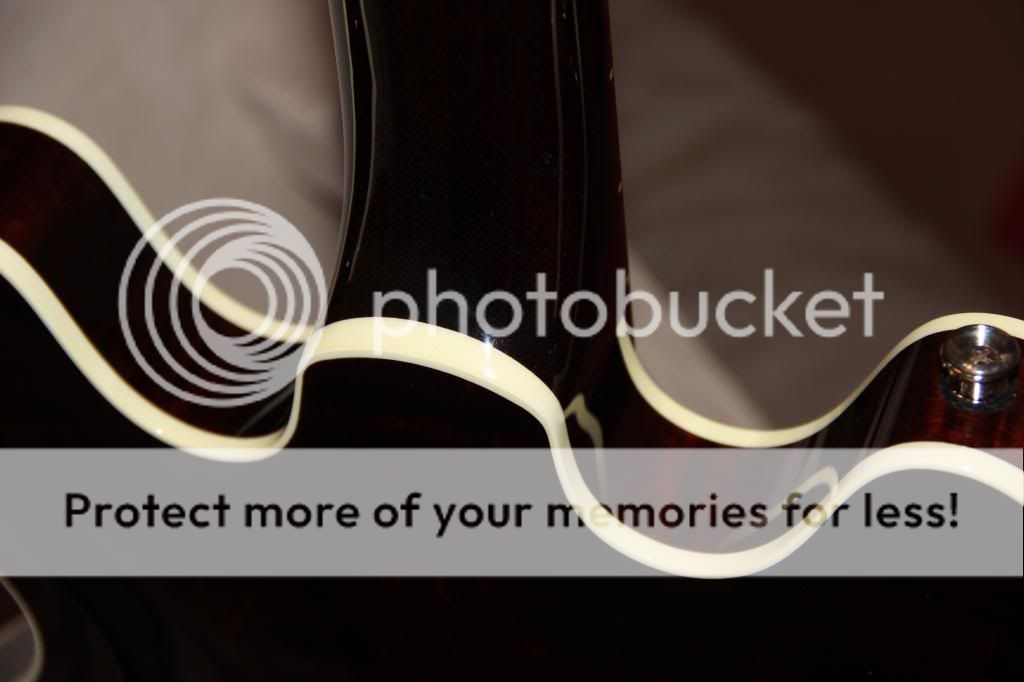 La jointure corps manche est excellente, la meilleure que j'ai pu voir sur une guitare électrique typée ES, avec un binding en ivoroid de grande classe, ultra solide et très esthétique.