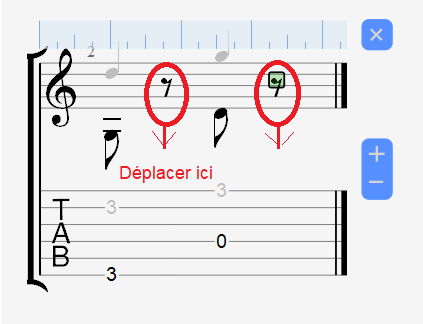Avec un logiciel concurrent, il suffit de sélectionner le symbole et de déplacer avec les touches directionnelles du clavier mais avec guitar pro, ce n'est pas si intuitif. Le basculement de mode CTRL + ALT + D ne permet également pas de faire la manipulation.