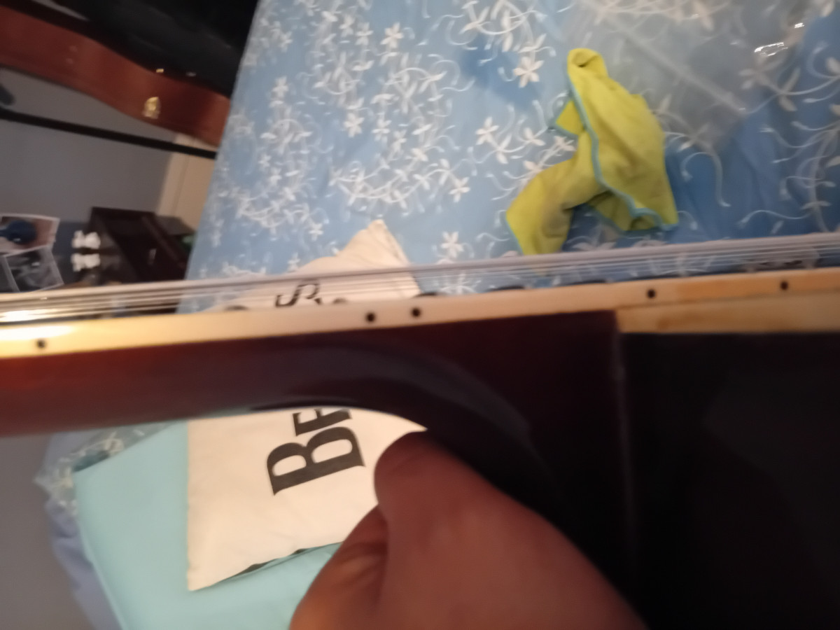 - Je pense que vous ne le verrez pas sur la photo mais si on regarde la guitare à plat, cordes vers la haut, on voit que le mi aiguë est légèrement plus haut que les autres cordes. 1 ou 2 mm peut être... Sauf que dans mon jeu c'est très gênant car j'accroche tout le temps le mi aiguë en remontant.