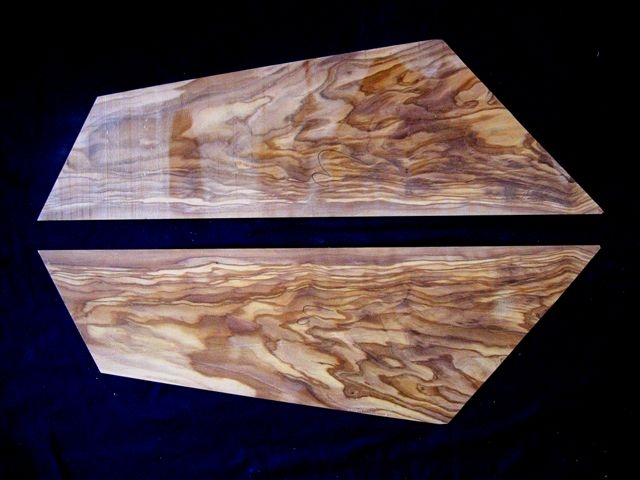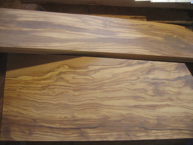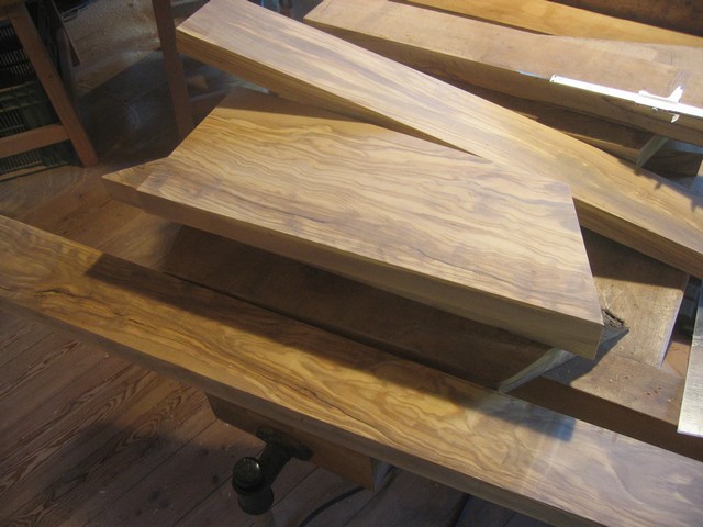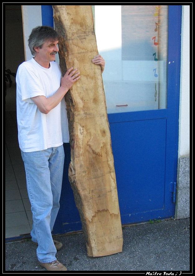 Comme nous évoquons l'olivier. Alors je ressors quelques photos. Ci-dessous une belle planche d'olivier juste sciée où l'on imagine encore l'arbre. La belle pièce d'olivier est entre les mains de Werner Shär le maître luthier d'André appelé aussi Yoda dans le mileu