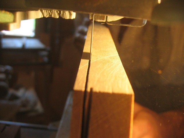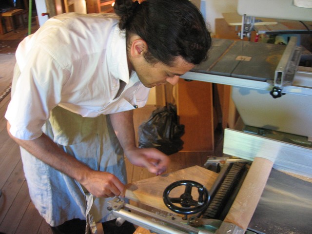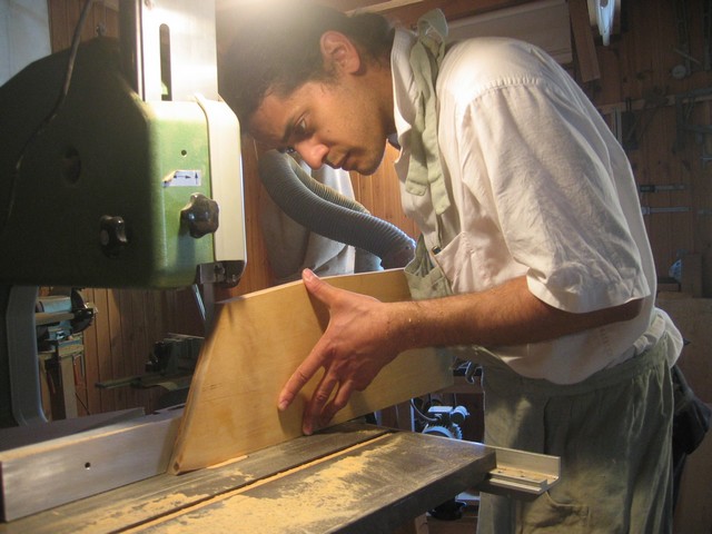 Après être découpée en différentes planches destinées au fond et aux éclisses. Les planches passent à travers la machine qui fait peur au doigts !