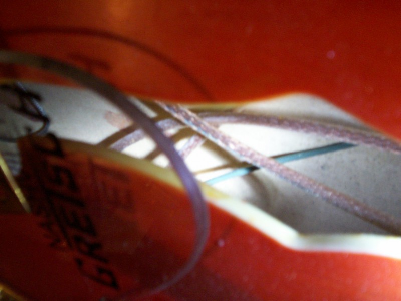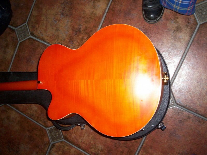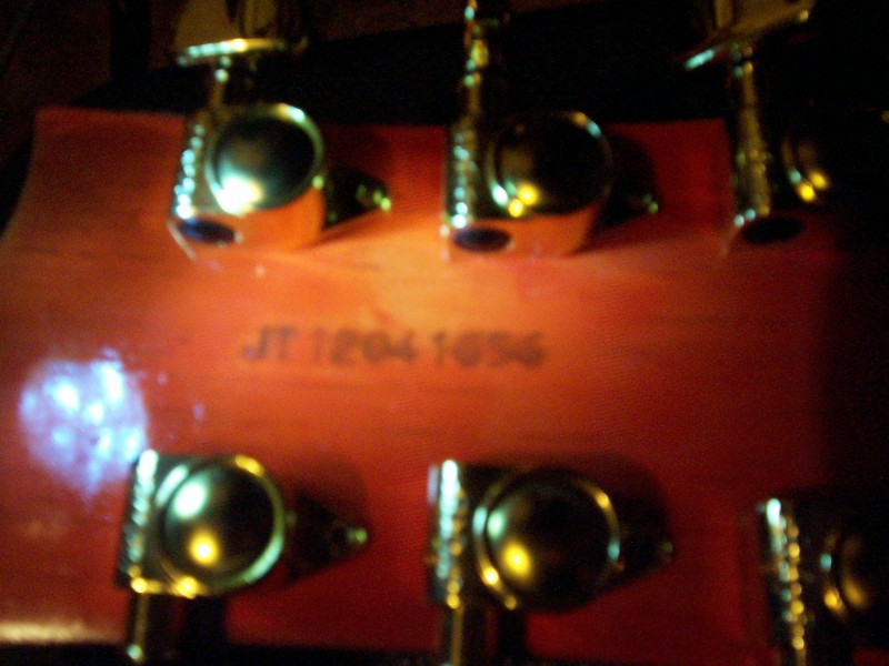 Si elle est vrai, c'est une guitare qui aurait subie des modifications: re-cablage, les initiales noires sur la caisse on du être rajoutées car traces de ponçage autour, et vernis refait à l'arrache un peu plus orange foncé que l'origine. Etant donné que cette guitare à été achetée en boutique j'aurai aimé avoir des avis.