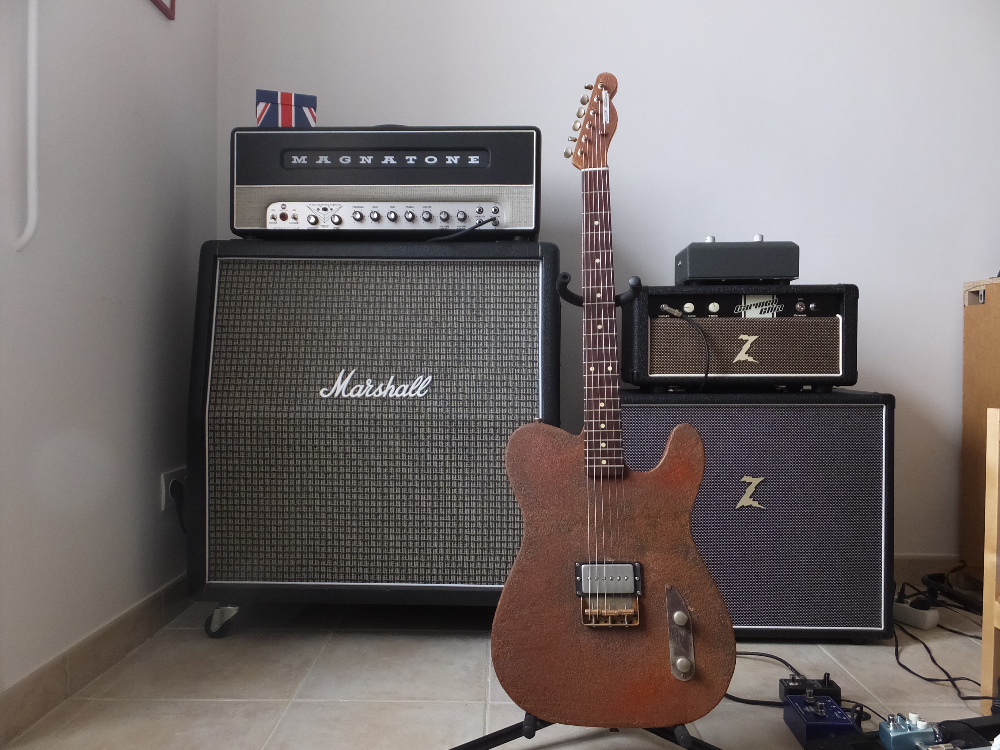 La Rusty est arrivée... une pure merveille. Un superbe travail de Cédric, tant dans le choix des matériaux que dans les finitions et ce, jusque dans les moindres détails. Rien qu'en la faisant sonner à vide on comprend qu'on a une guitare de très haute qualité dans les mains, avec un son rond et chaleureux, que n'importe quel bon ampli magnifiera avant de le faire tordre. Bref, une Esquire unique, tout droit sortie d'une grange du Mississipi, atypique et empreinte d'une saveur de vieux blues , même le Révérend ne l'a pas dans sa collection!