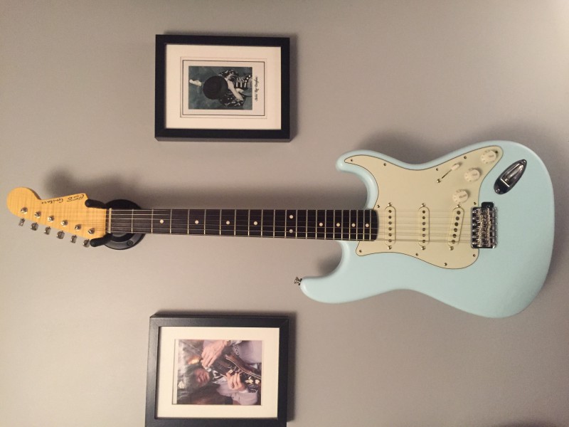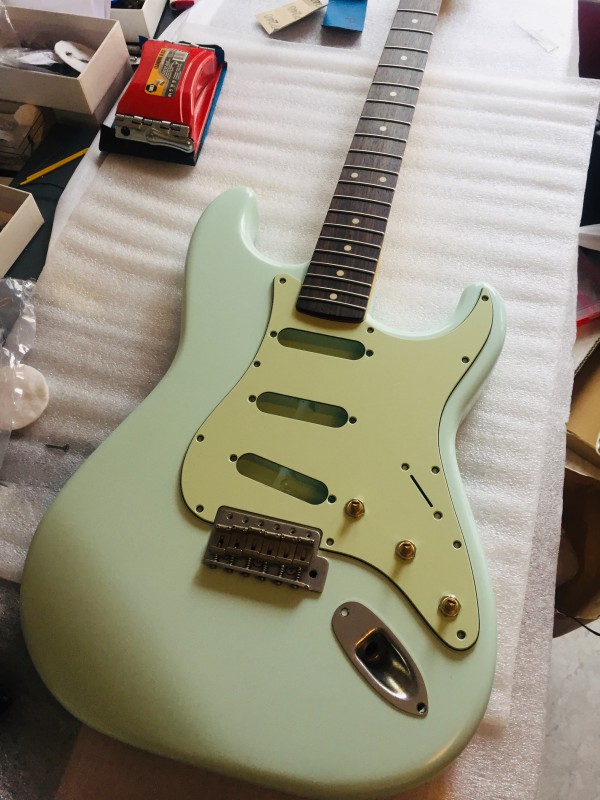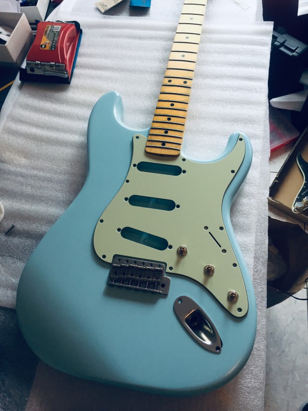 Une guitare bleue avec un bon vernis finit toujours par devenir turquoise ou verte