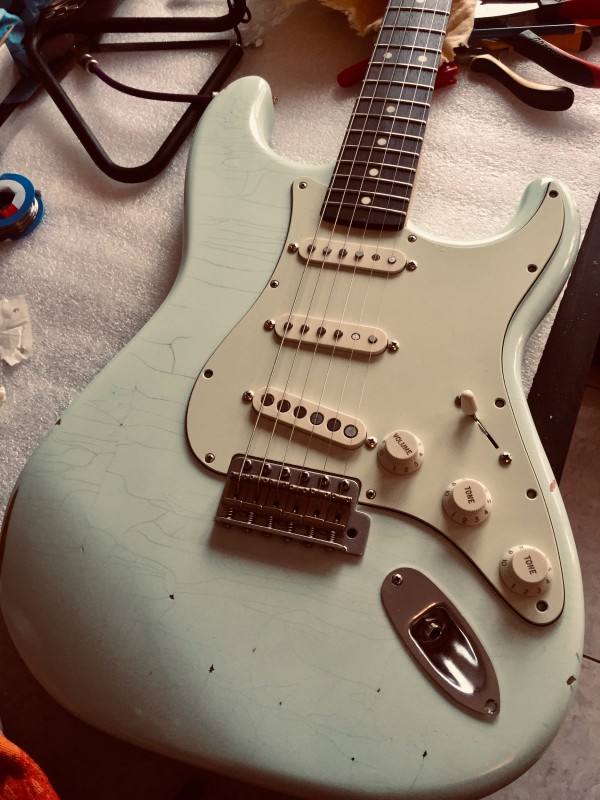 Voilà pour résumer, un manche flammé au delà de mes espérances avec un palissandre foncé de folie. Les micros Haussel et le fonctionnement de l'électronique sont une tuerie. Cerise sur le gâteau, les réglages sont absolument dingues à tel point que ma Clapton est chez Cédric en ce moment même pour réglage...