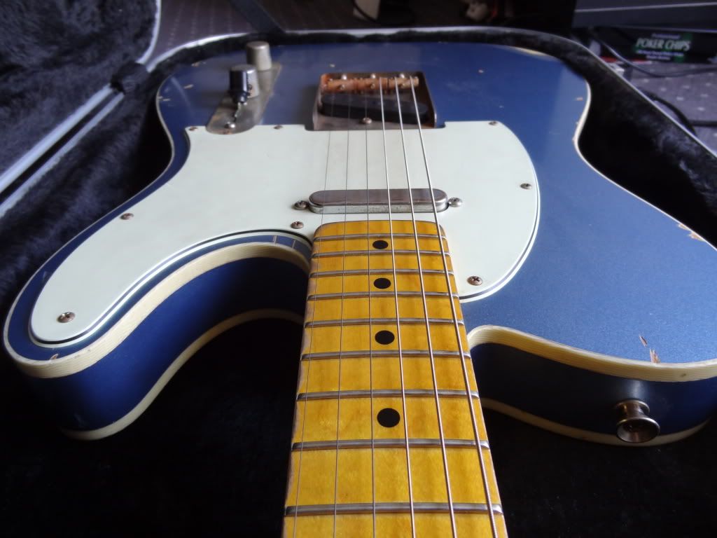J'ai essayé des '52, des '57 et des '63. C'est étonnamment la '63 qui claquait le plus, elle a un son très métallique, cinglant mais pas hargneux, harmonieux, très beau. En mettant le tone à fond avec une disto légère réglée assez aigue, on obtient vraiment le son de la musique du film le bon, la brute et le truand. Le tone et le volume sont très réactifs. Bref, je trouves pas de mots suffisamment réalistes quant à la qualité de cette guitare. Une TC63 donc avec le binding autour du corps, en ice blue metallic light relic avec touche érable (!) pour être précis et il faut dire qu'elle m'était destinée..! J'ai un peu hésité à cause de la couleur car je voulais autre chose que du bleu pour changer mais son son absolument fantastique m'a décidé.