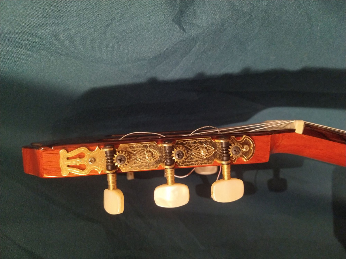 Table en Cèdre Massif , manche, dos et éclisses en Acajou, touche et chevalet en Palissandre et Mécaniques dorées