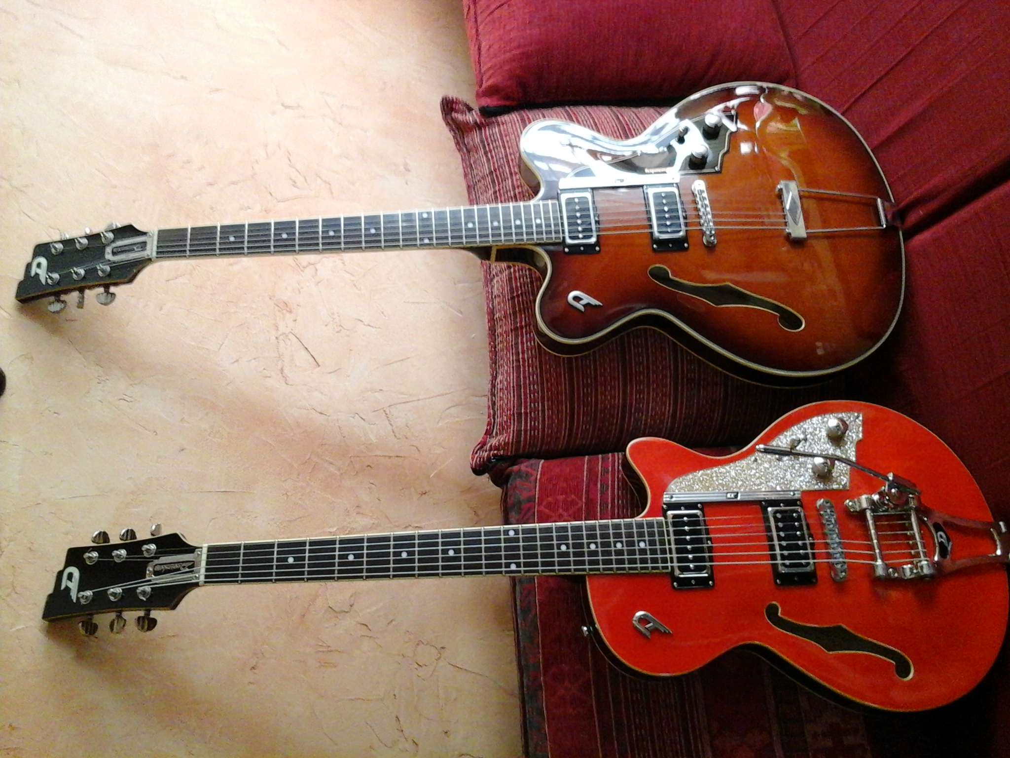 Avec l'arrivée des nouveaux modèles ( les fameuses troisième génération avec la fixation de la tige qui ressemble a un potard, les mécaniques z tuners, pas la star player 3 a corps plat, hein), ils se sont mis a fournir un nouvel etui avec la guitare ( la plupart du temps) dans lequel la tige de vibrola semble mieux tenir.