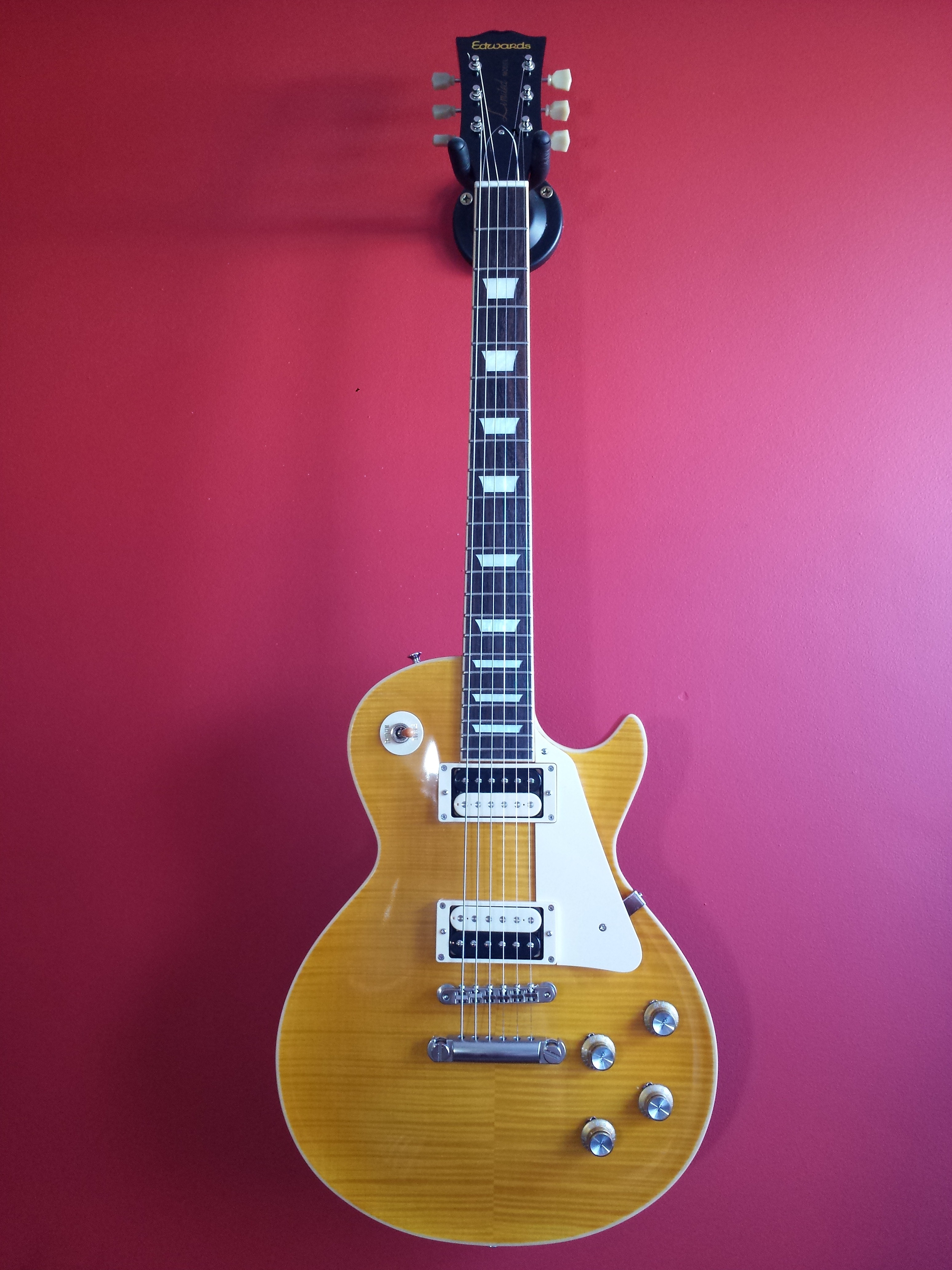 Bon ben voila je m'introduis dans le club des edwardsiens....J'ai eu pas mal de guitares j'ai vraiment été surpris par ces productions! La mienne c'est donc une 108 LTS de 2014. Changement de micros prevu d ici peu je ne suis pas tres fan des sh1 sh4.....Bon photo!