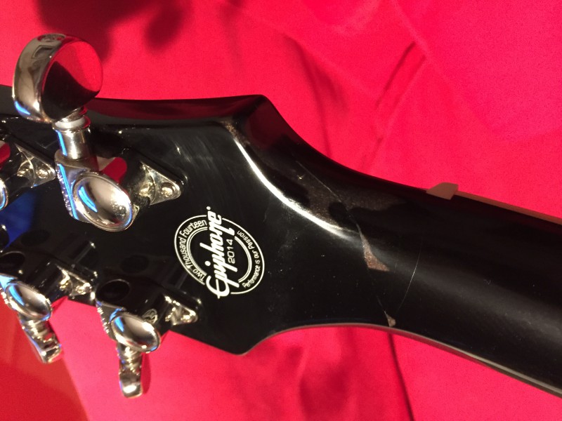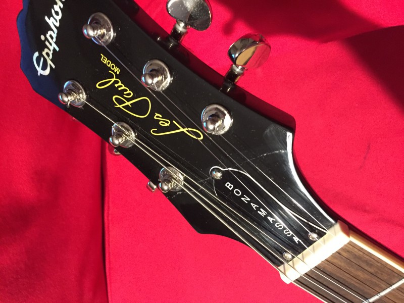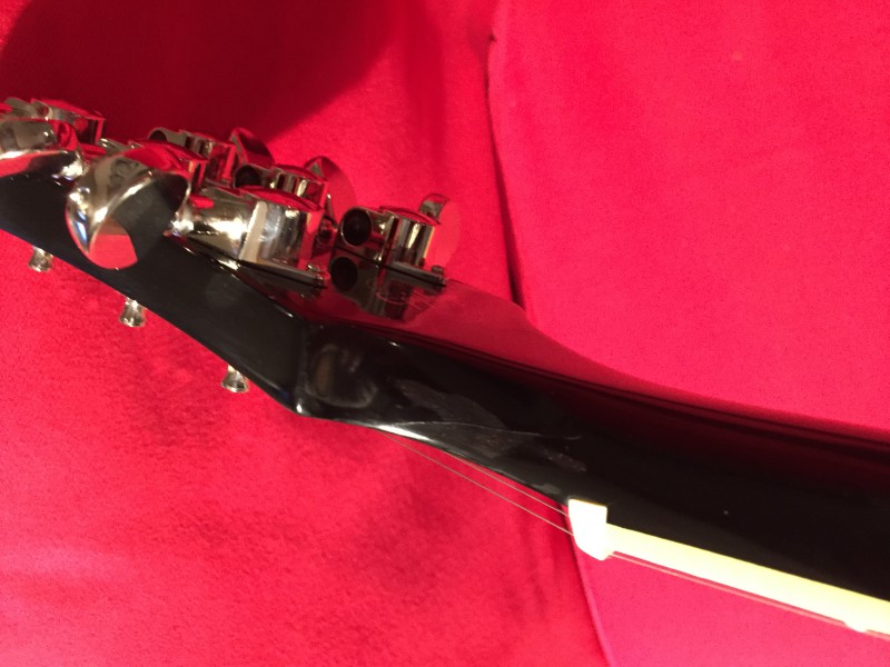 Plus sérieusement, en début de semaine, je reçois un texto laconique "La les Paul est prête". Je n'avais pas de news mais j'avais dit à Tony Girault que j'avais le temps, donc je ne m’inquiétais pas. Du coup délai super rapide (1 bonne semaine) et client super ravi : le collage a été réalisé dans les règles de l'art, la cassure reste visible mais c'est très discret. Je vous met des photos plus bas. Niveau réparation, on est à mi chemin entre le collage simple de la tête et une remise à neuf. Tony a recollé puis remis une couche de résine teintée. Ni vu ni connu je t'embrouille. Dixit mon sauveur : "je t'ai fait une réparation propre pour un tarif en rapport avec la valeur de la guitare". C'est pas la voix du bon sens ça ? Cadeaux Bonux : un nouveau sillet de qualité qui traînait par là pour remplacer mon sillet plastoc, un réglage et des cordes neuves. Niveau budget on est bien en dessous des 250 évoqués plus haut ! Je ne vous donne pas le tarif exact : ça n’aurait pas de sens chaque guitare et chaque cassure sont différentes. Dans mon cas, coup de bol, la cassure était bien nette. L’info que je peux juste confirmer à présent, c’est que ce type de dégât est réparable pour un tarif "raisonnable" et qu’il ne faut pas hésiter à demander des devis à plusieurs luthiers. C’est ce que j’aurai du faire dès le départ, gros naïf que je suis.