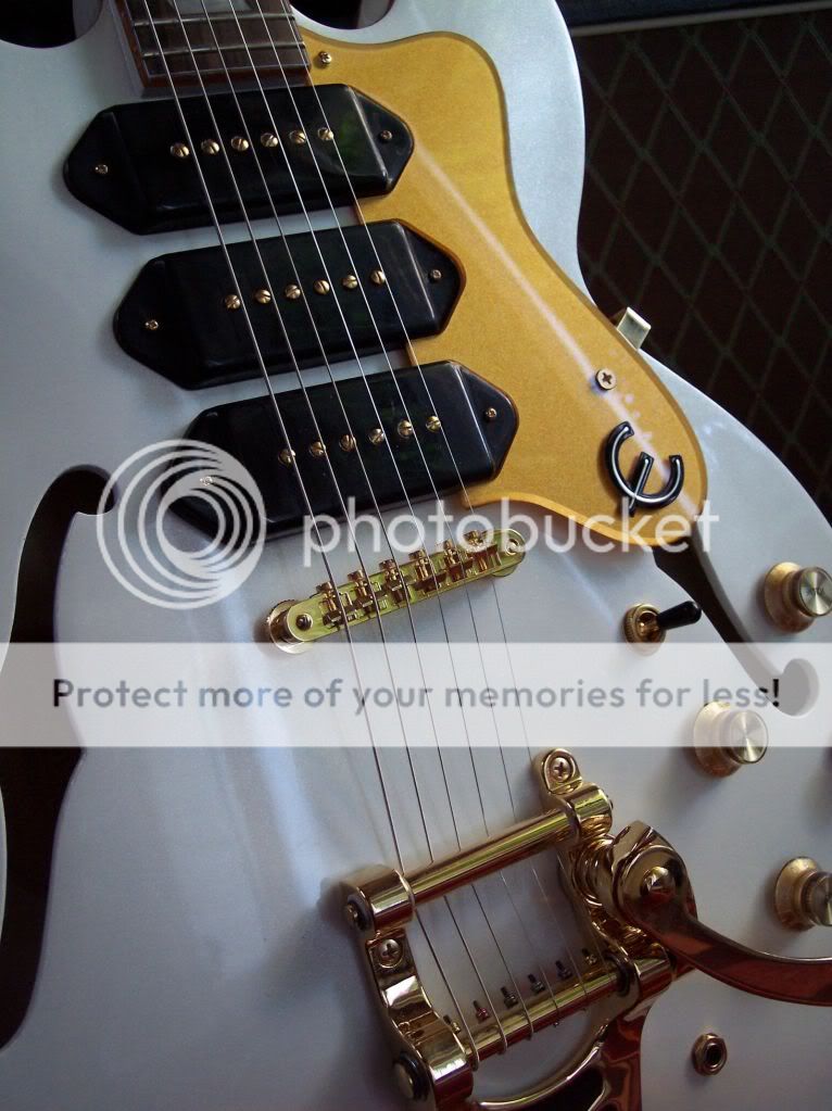 Alors, l'ensemble est très bling évidemment, et les bindings sont d'un goût ... "spécial". Mais l'ensemble est cohérent et séduisant sans faire cheap du tout. Le bigsby est de bonne qualité et un usage modéré ne désaccorde pas trop la guitare (j'investerai cependant peut-être dans un meilleur bridge).