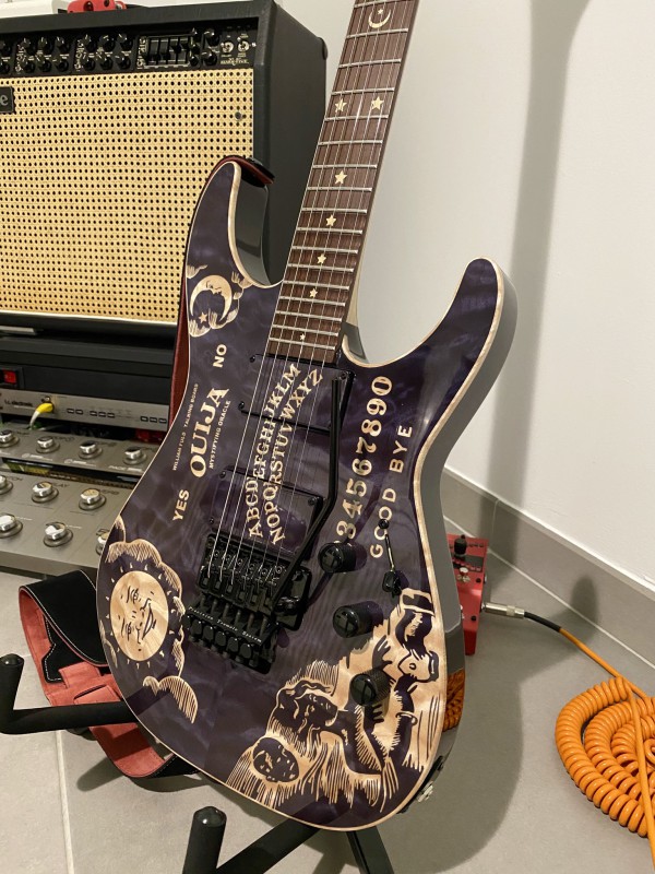 Celle ci a des dimarzio evo + split, un floyd avec piezo, des incrustations érable vernis sur palissandre brut... et surtout un son de folie