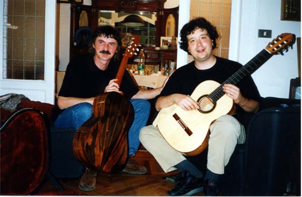 Et... pendant qu'on y est, à montrer du Rio... sur cette photo, on voit (a gauche) Werner Schär, mon maître-luthier, en bonne compagnie... et, dans sa main, il tient une "Rio" pas mal non plus... qu'en penses-tu ? (l'autre côté est aussi en épicéa...)
