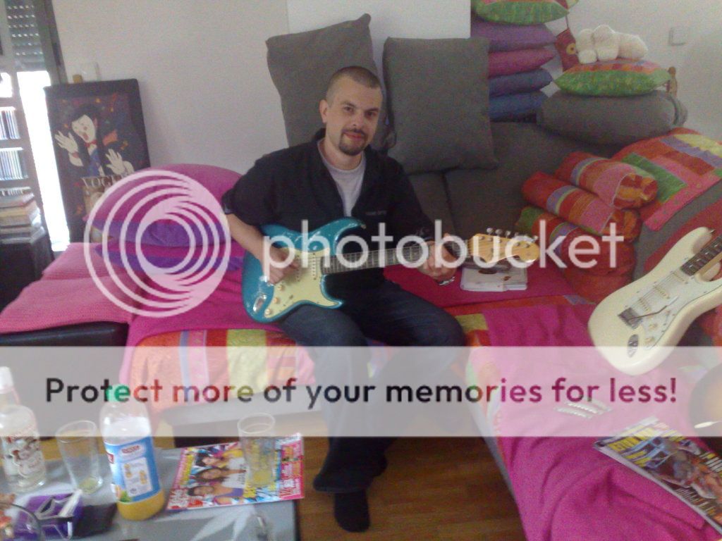 Strat 63 near mint Lake placid blue, meme si la guitare est nikel on voit bien que la teinte est un peu plus verdasse du au cellulo jaune par dessus le bleu.