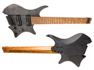 Ces guitares ont plusieurs particularités. Déjà, elles n'ont pas de tête, ce qui réduit le poids et supprime le problème du manche qui pique du nez en position debout. Elles ont aussi deux coupes pour pouvoir jouer en position assise normal et classique. Le manche a un profil très particulier. Je ne pourrai pas bien l'expliquer, car je ne l'ai jamais essayé. Mais apparemment, c'est une vrai révolution. Le système fanned fret, qui n'est pas forcément quelque chose d'ergonomique, en tous cas ce n'est pas pensé pour. Mais pour avoir testé, ça se prend mieux en main qu'un frettage classique.